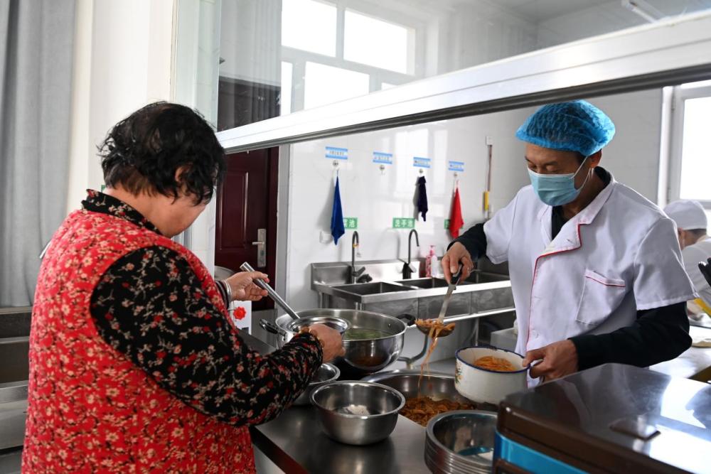 在酒泉市金塔县金塔镇营泉村集中安置点的孝老饭庄,老年人在取餐窗口盛汤取餐(2024年12月25日 摄)。新华社记者 范培珅 摄