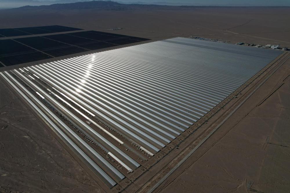 该电站通过多排平行布置的反射镜阵列,将太阳光反射到固定于高处的线性吸热管上,加热管内熔盐,再以热熔盐加热水,最后以水蒸气推动汽轮发电,实现了光能到热能、热能再到电能的转换,是当前光热发电领域最具代表的技术路线之一。