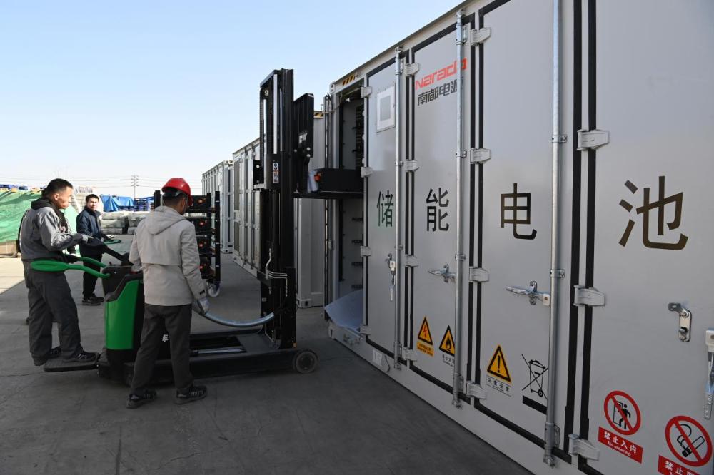 在位于酒泉经济技术开发区的酒泉南都电源有限公司,工作人员给储能电池集装箱安装电芯(3月10日 摄)。新华社记者 范培珅 摄