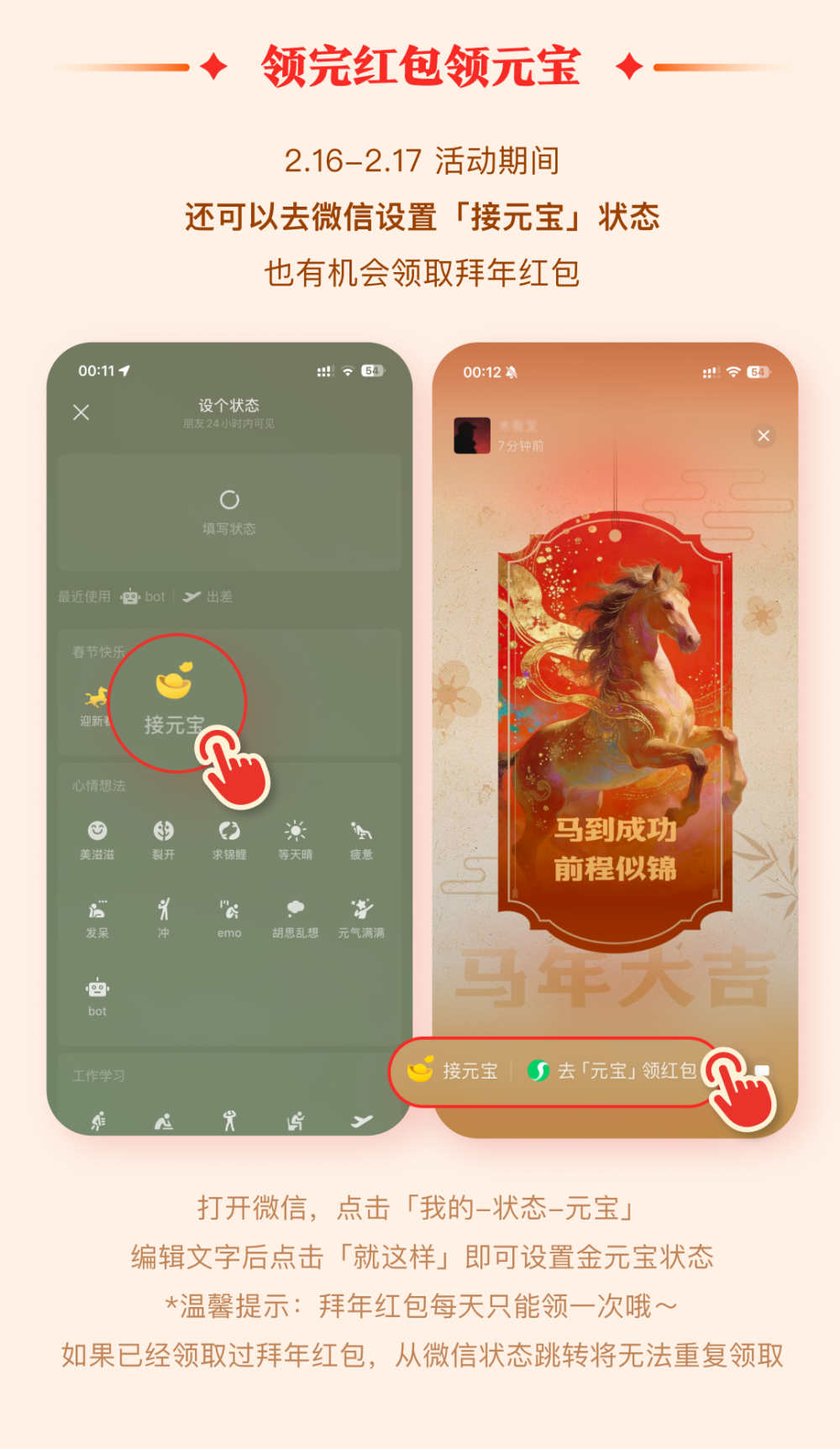 元宝宣布:加送100张万元小马卡,今日16时开启,无需集卡抽中即得10000元现金;打开元宝、朋友圈点拜年、微信设置接元宝状态均可领红包