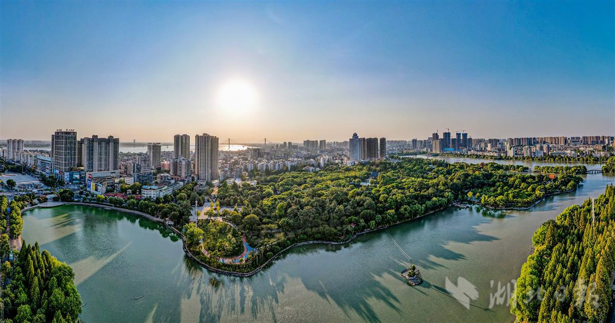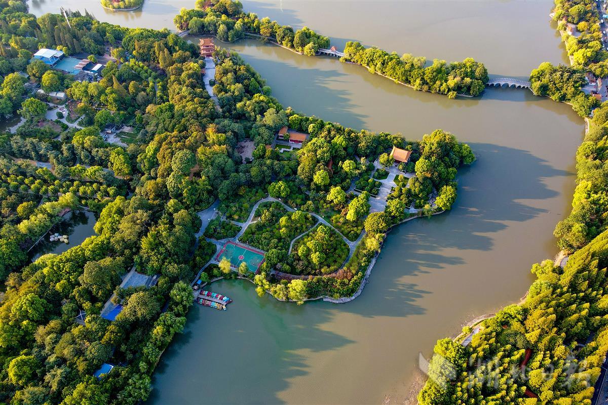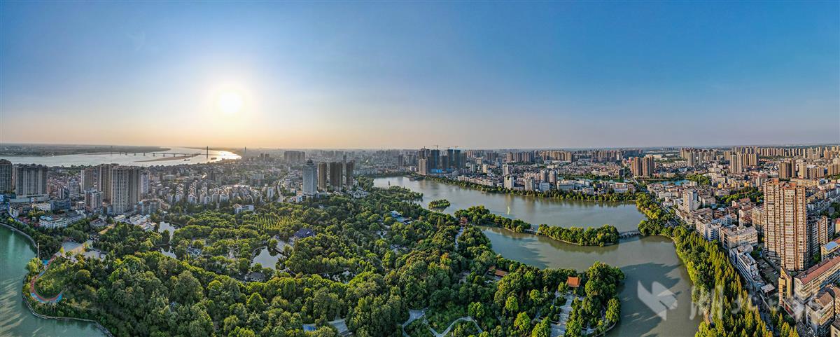 8月29日,无人机鸟瞰位于荆州市中山公园东侧的江津湖,湖光秀丽,水清岸绿,风景如画。