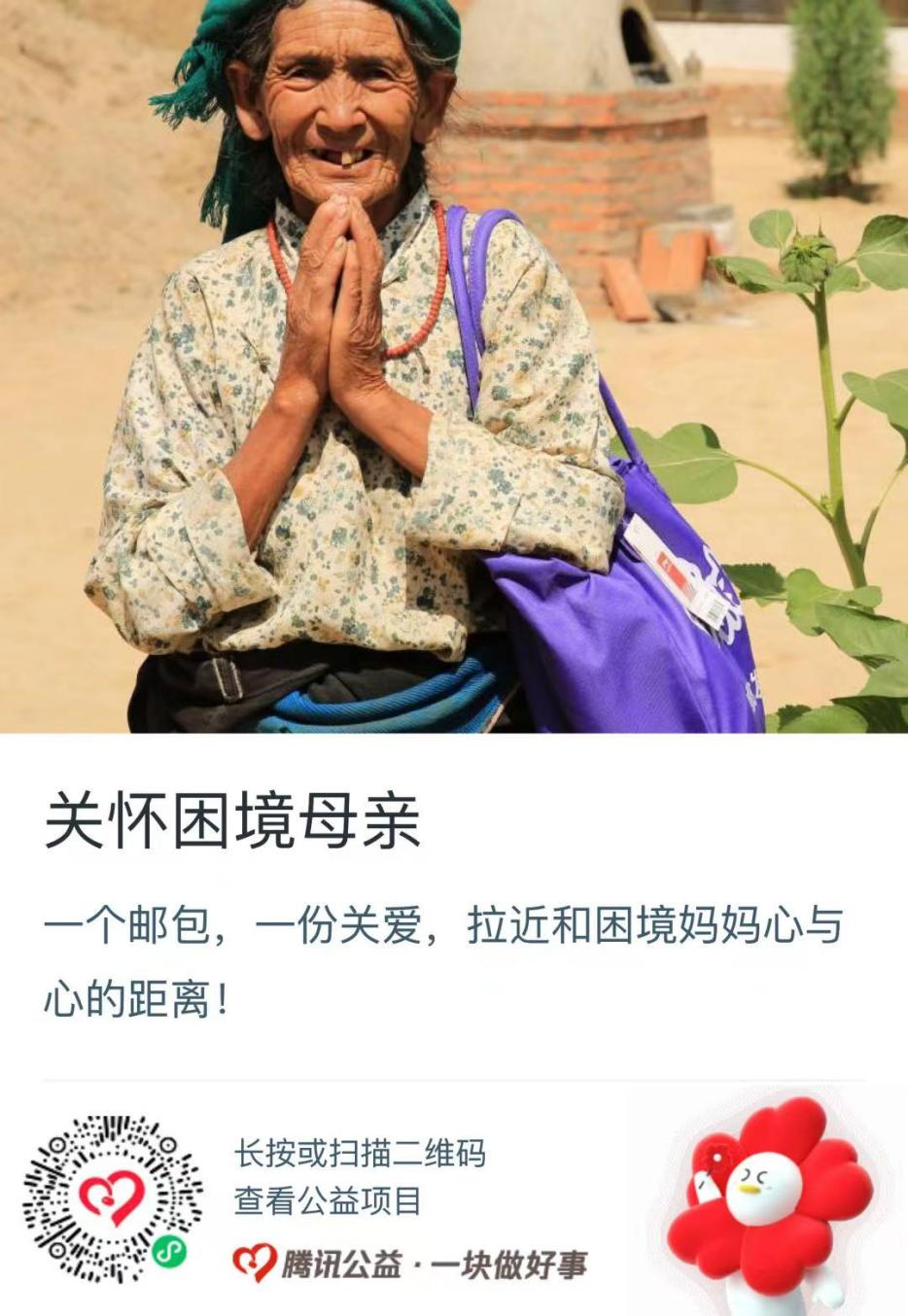 中国妇女发展基金会“母亲邮包”项目将为困境母亲及家庭发放生活必需品,分为价值200元的“母亲暖心包”和价值300元的“母亲家庭健康包”,并可结合捐赠人需求和实际设置专属定制包。除腾讯公益随机配捐以外,中国妇女发展基金会按1:1为项目提供配捐支持。