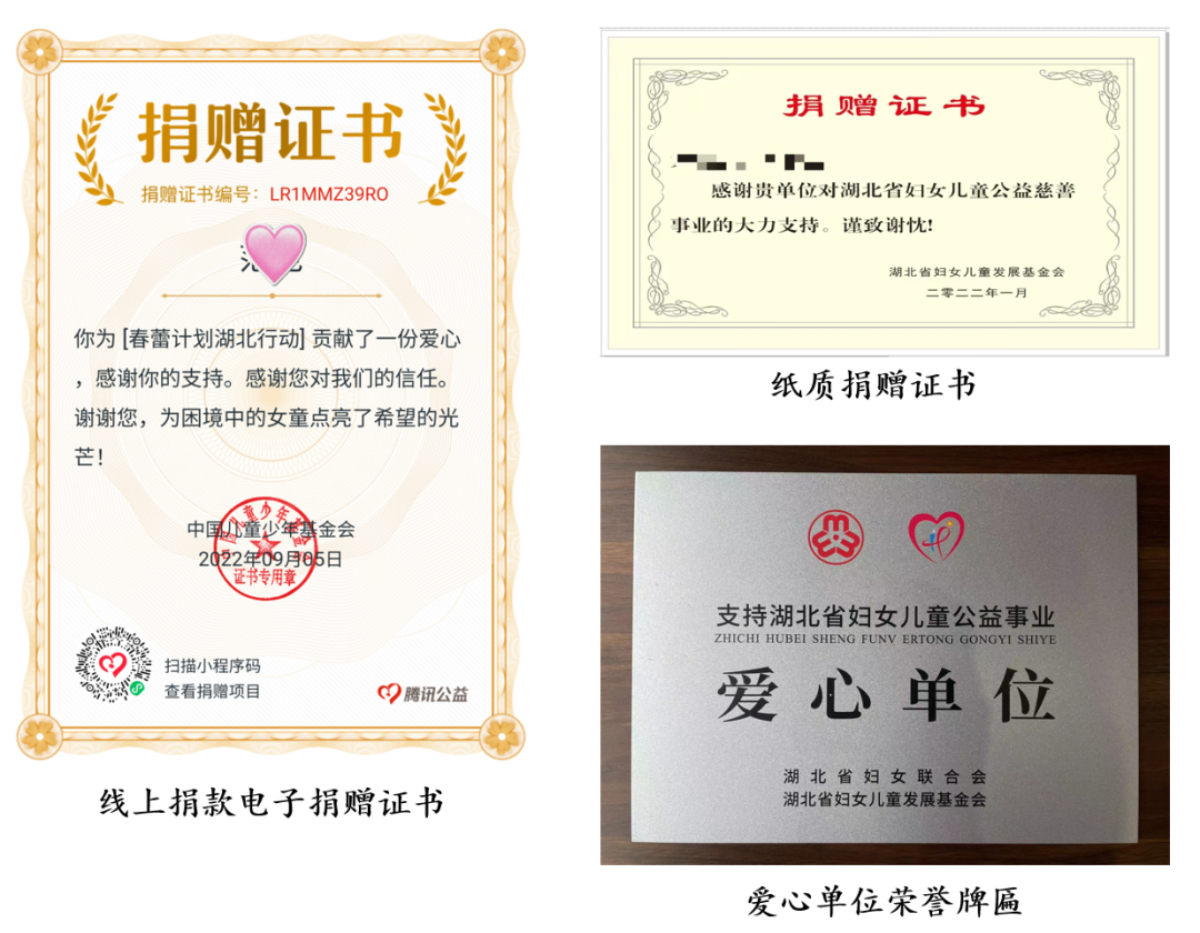 您在腾讯公益平台的每笔捐赠都将即时获得电子捐赠证书。向湖北省妇女儿童发展基金会捐赠,个人年度捐赠累计达1万元、单位年度捐赠累计达10万元可获得纸质捐赠证书,单位年度捐赠累计达30万元可获得荣誉牌匾。湖北省妇女儿童发展基金会还将邀请爱心单位和爱心人士参加公益探访,走进项目实施地,了解项目运行的真实情况。