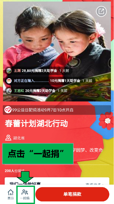 操作方法:打开您想支持的项目,点击左下角的“一起捐”,填写相关信息,即可发起属于您的“一起捐”,还可将“一起捐”分享给好友,邀请更多爱心人士加入爱心队伍。流程如下: