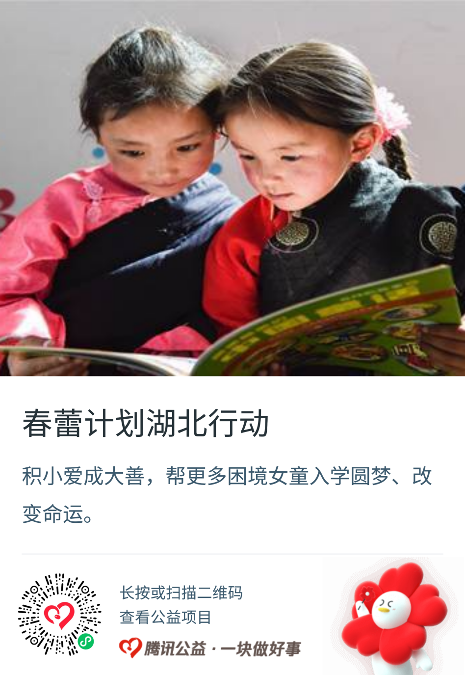 “春蕾计划”由全国妇联倡导、中国儿童少年基金会发起,致力于改善困境家庭女童受教育状况,并形成了关爱女童教育、安全、健康的多方位帮扶体系。“春蕾计划——梦想未来”湖北行动将为全省困境女孩提供生活学习补助,帮助她们实现人生梦想。除腾讯公益随机配捐以外,中国儿童少年基金会按1:0.6为项目提供配捐支持。