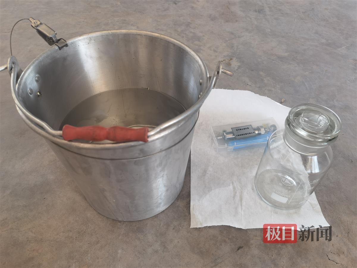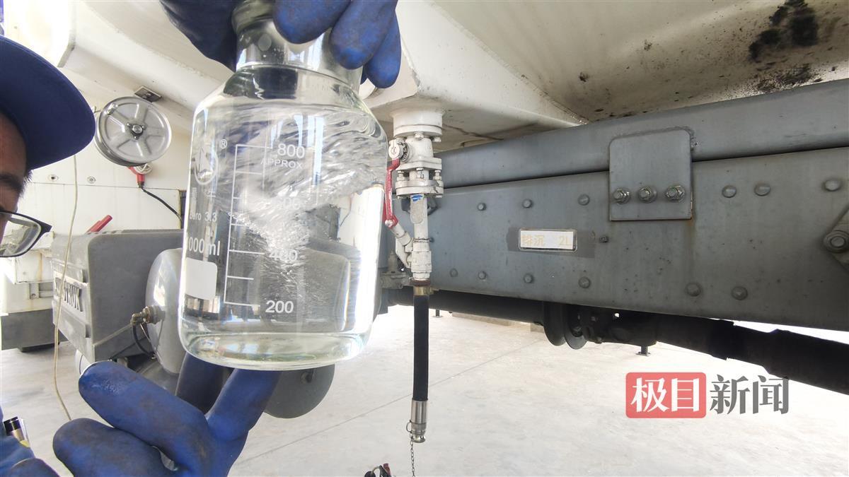 极目新闻记者注意到,在加油站内的一辆罐式加油工作车前,加油员于先生正在例行检查油品质量。他将空桶放置在罐式加油车的排油管道下方,用透明的玻璃器皿接了一些航油,航油无色无味、清澈透明,随后加油员用力摇晃手中的玻璃器皿,仔细观察航油形成的小漩涡。