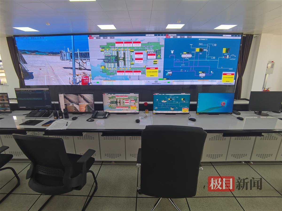 在鄂州花湖机场航空加油站调度室,机坪ESD监控系统正在运行,大屏幕显示着机坪每个停机位、可燃气体是否过量、输油管道的工作运行等情况。随着工作人员的操作,停机坪上的监控摄像头还可以移动角度和方位,以此不间断实时监测机场情况。