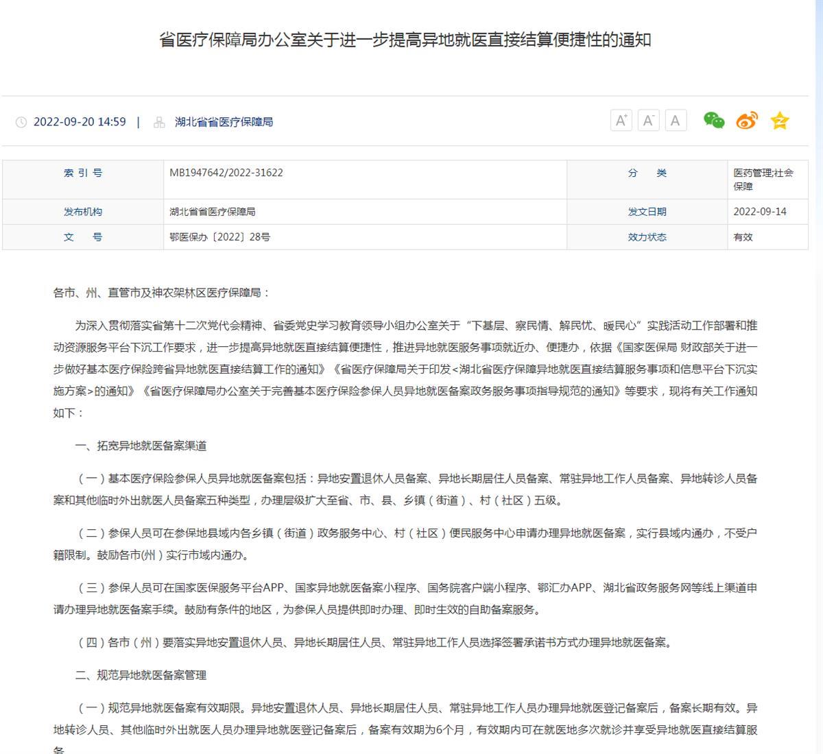 日前,湖北省医疗保障局印发了《关于进一步提高异地就医直接结算便捷性的通知》(以下简称“通知”),从拓宽异地就医备案渠道、规范异地就医备案管理、明确异地就医结算政策、扩大异地就医定点医药机构覆盖面、加快推进信息系统改造等五个方面部署优化相关政策,进一步提高异地就医直接结算便捷性,确保湖北省参保人员享受更加高效的异地就医结算服务。