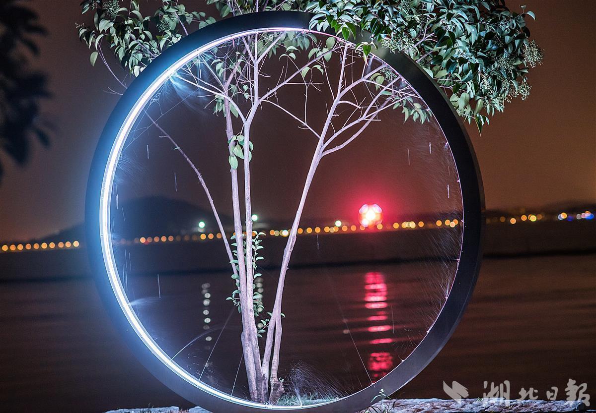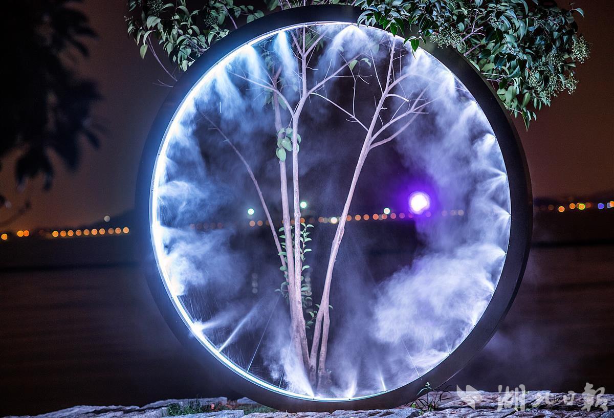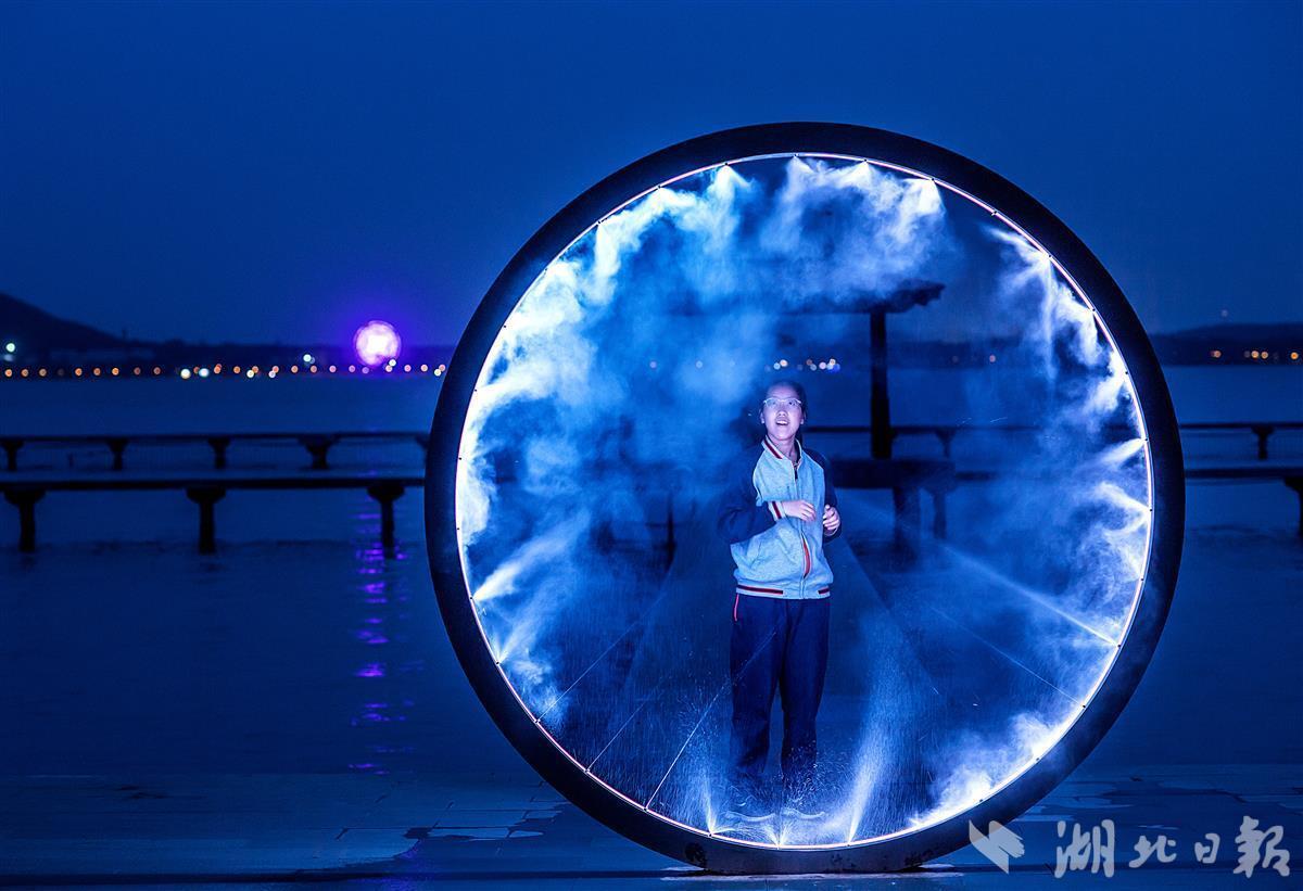 9月23日晚,武汉市东湖听涛景区旧游泳池岸边,两座新增的圆形线框雕塑,夜间可随音乐变动光影,并散发出清凉的水汽喷雾,为游客增添打卡的朦胧感及漫游的清凉感。
