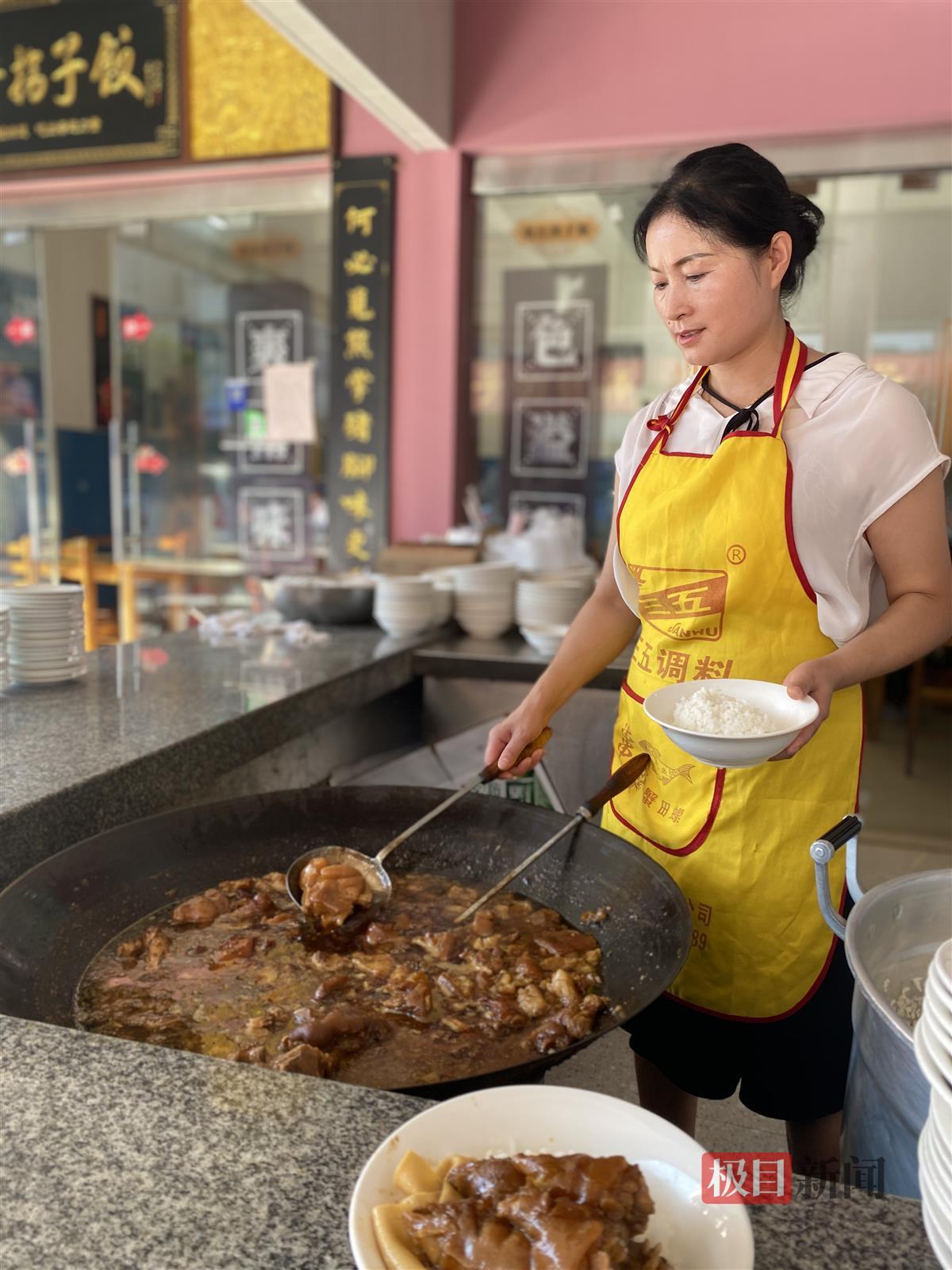 店老板代萍丽今年44岁,她说,跟随师傅老汪学成手艺后,师傅交给她打理。“做拐子饭没别的诀窍,耐心慢熬。”每天采购新鲜食材,十几道工序,前五小时大火煮,后三小时文火煨,满8小时才好吃。一份拐子饭售价18元,小菜免费。代萍丽每天要准备100多斤的猪腿肉,小店好的时候一天能卖300多份。