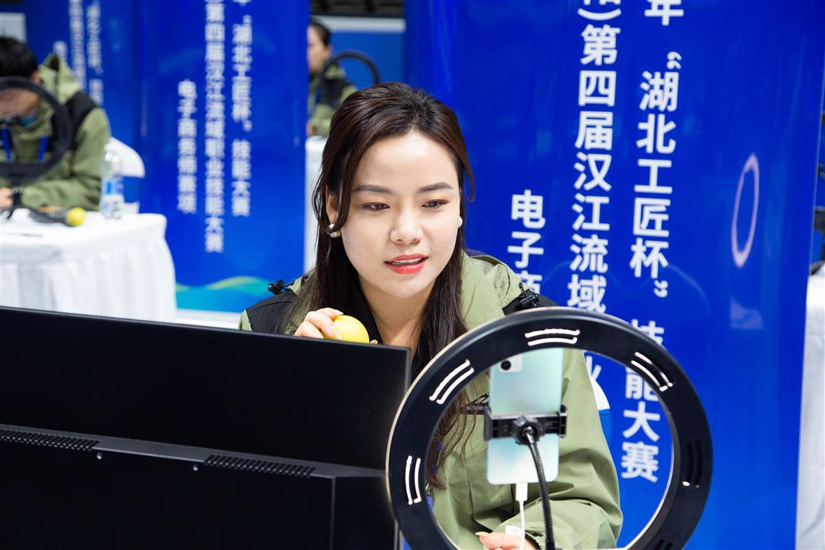 “新疆库尔勒香梨,皮薄,汁水多,含有大量果糖,营养十分丰富。”在比赛现场,20余位参加电子商务师赛项的选手,正对着手机进行着产品直播介绍。在大赛中,选手将作为卖家完成视觉营销设计,并利用网络推广和网店直播等手段提高店铺运营效果。