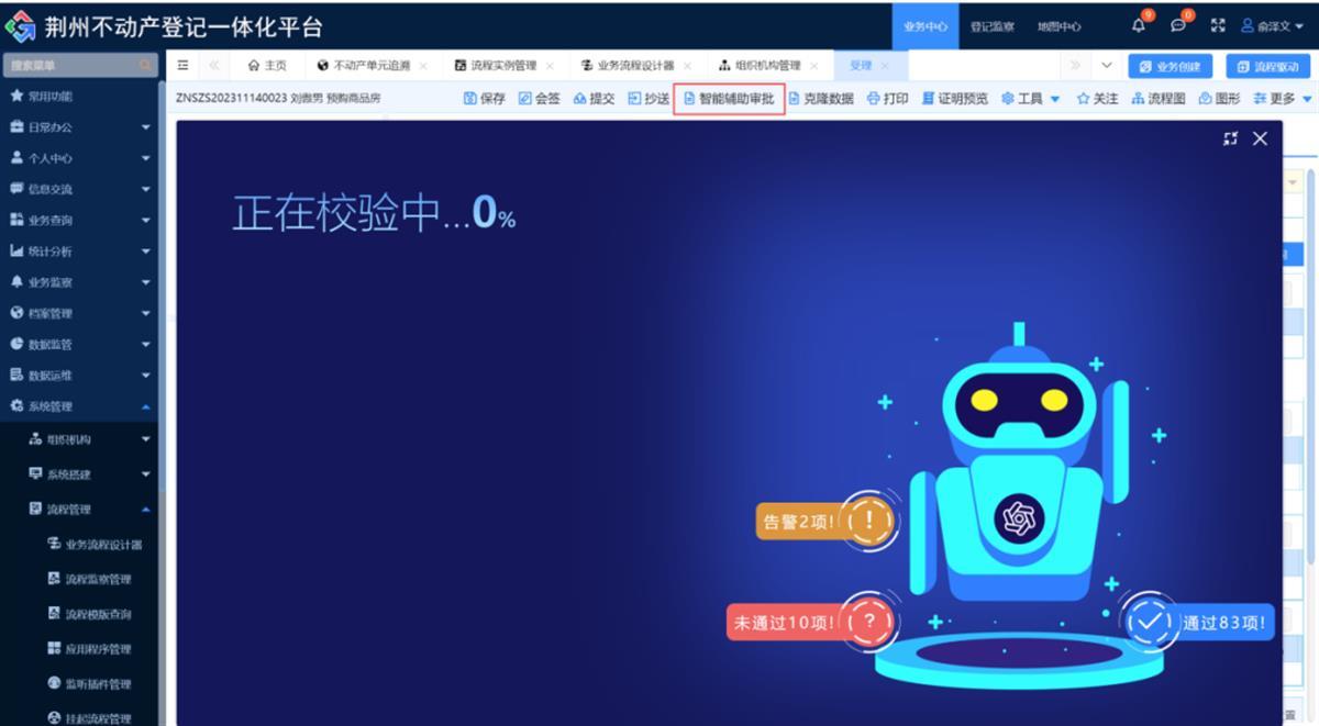 而AI智能审核功能能够将云计算、大数据和人工智能等新技术与不动产登记工作相结合,通过标准化、规则化的登记审核校验库,执行自动化审核操作。