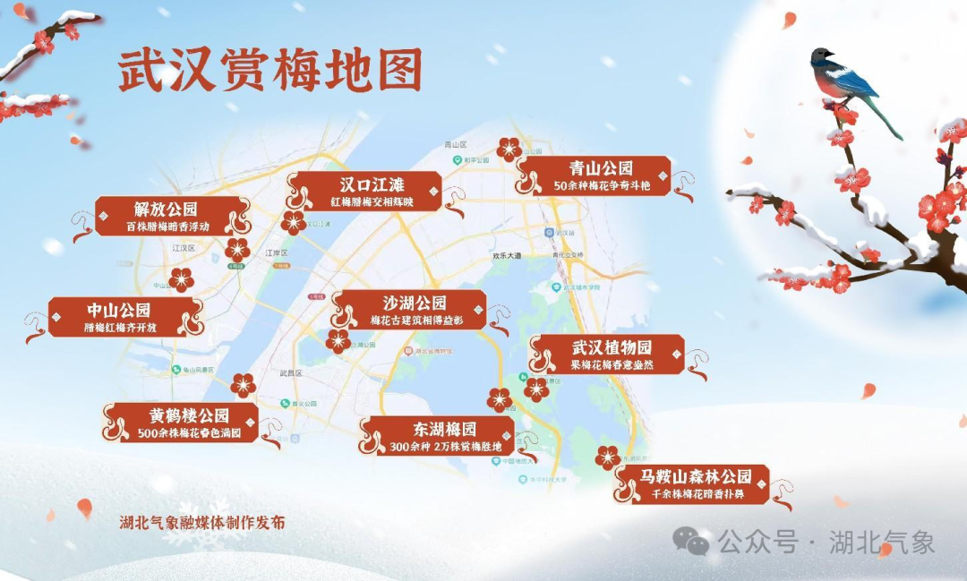 梅花与松、竹并称为“岁寒三友”,属于耐寒花卉,影响梅花开花时间的因素主要是积温,开花前10天或15天的气温最为重要。研究表明,日平均气温5℃以上,积温达到160℃左右,梅花就能开花。作为武汉市市花的梅花在江城种植较为广泛,许多公园都可观赏。
