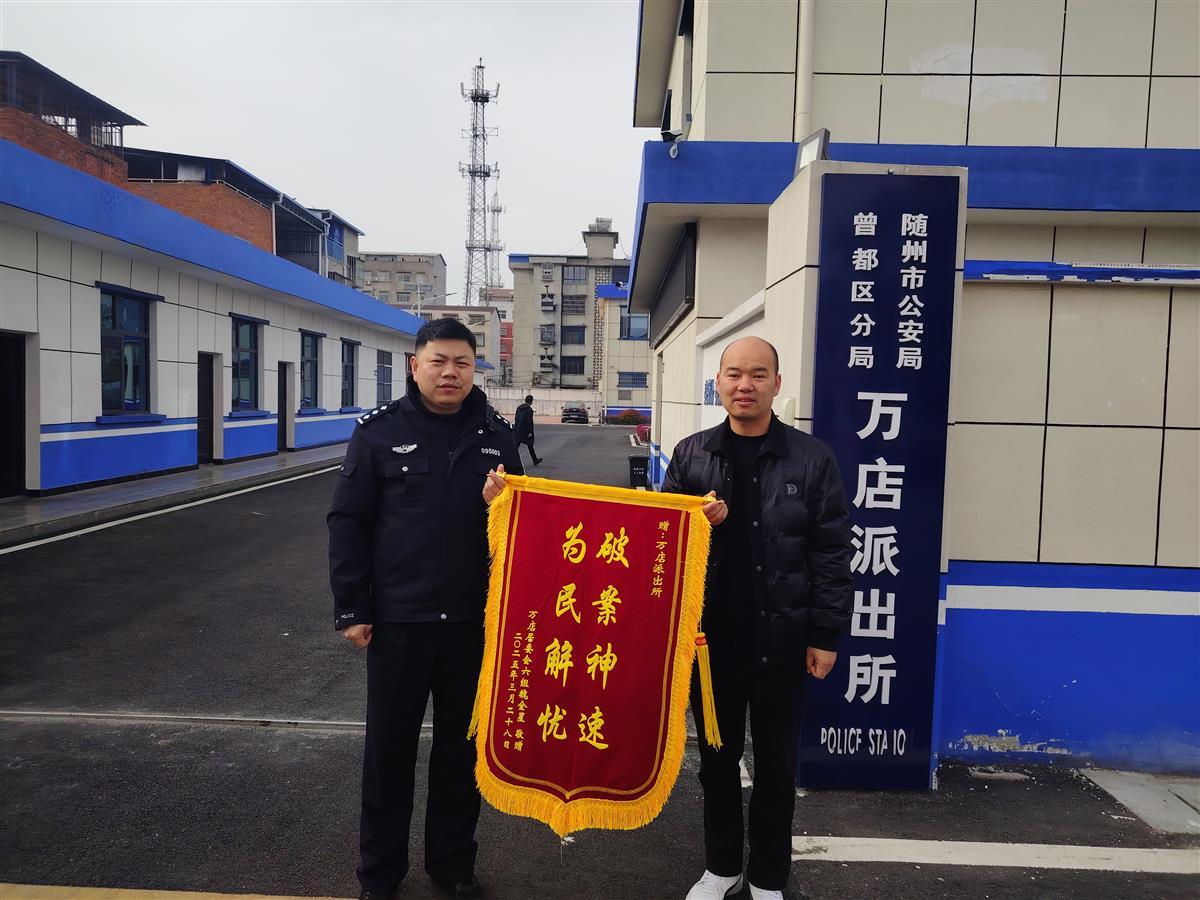 3月30日清晨,朝阳初升,随州市曾都区万店镇居民卫先生携家人满怀敬意,专程赶赴万店派出所,他们将一面绣有“雷霆出击护民安 真心为民显担当”的锦旗,郑重地交到民警手中。锦旗上的烫金大字在晨光下闪耀夺目,背后是一段警民情深的暖心故事。