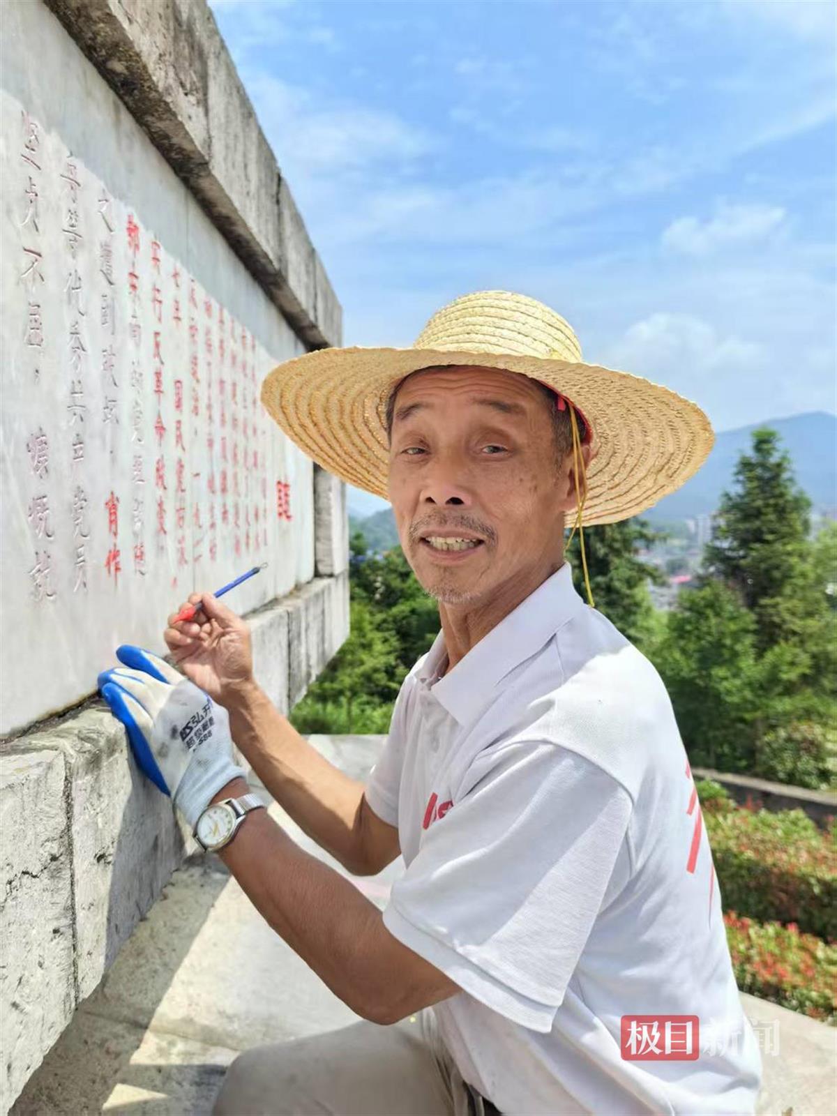 “有的墓碑上的字看不清,来瞻仰烈士的人们就会问我。”舒在则说,除了这次,他也经常不定期描字,哪里看不清楚他就描哪里。2017年,他还自费三千多元请人搭了架子,给十几米高的纪念碑描字,描正下方文字时,他站也不是、跪也不是,猫着腰,一干就是三四个小时。