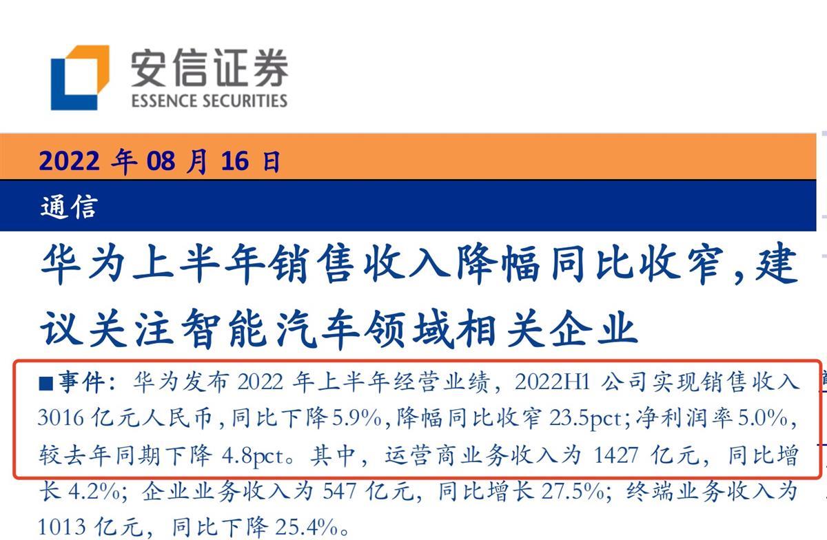 2022年上半年华为销售收入下滑(图片来源:安信证券研报)
