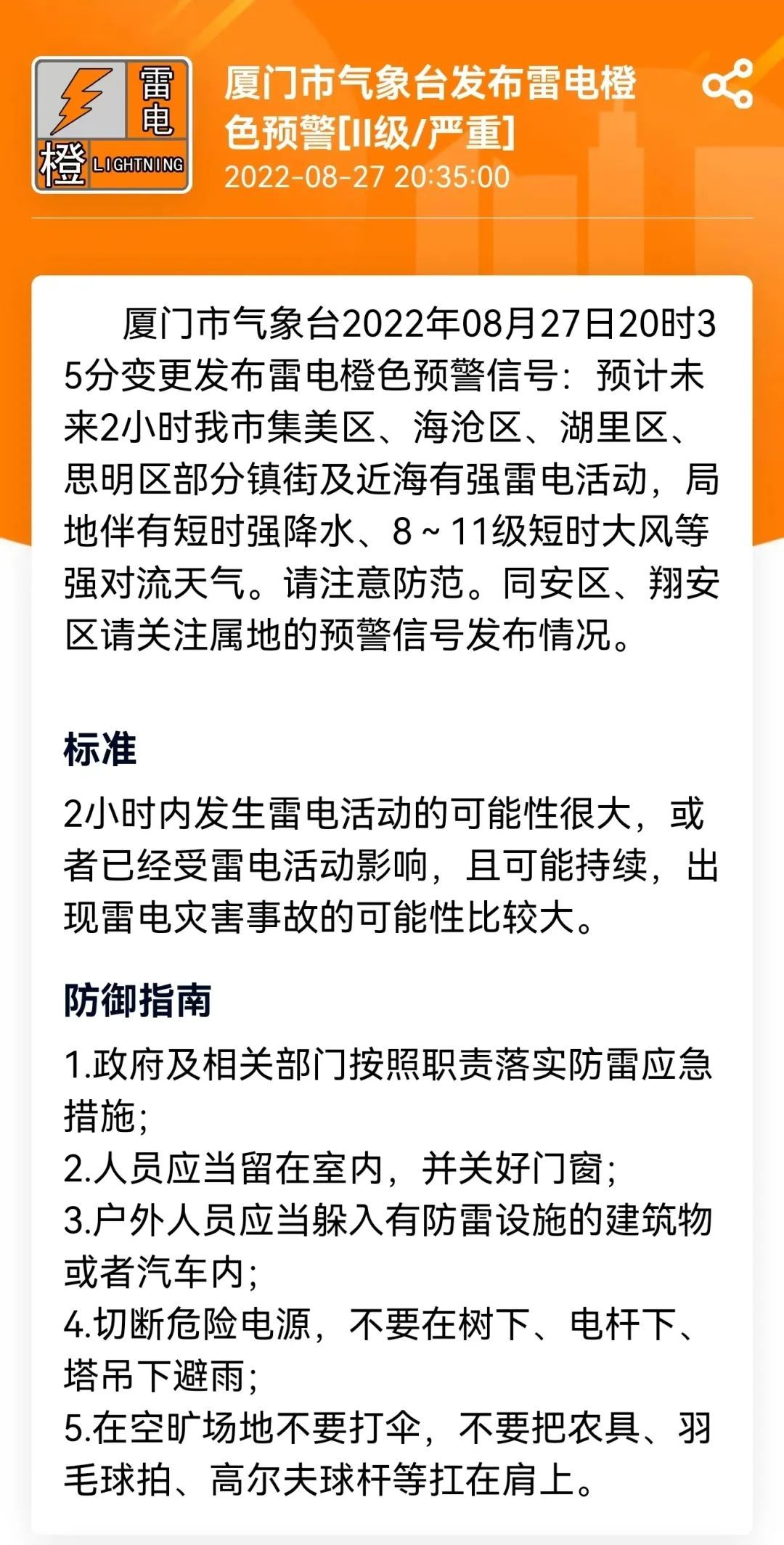 雷电橙色预警信号