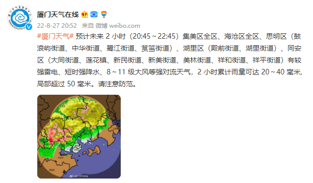 据@厦门天气在线 20时52分发布的消息,预计未来2小时(20:45~22:45)集美区全区、海沧区全区、思明区(鼓浪屿街道、中华街道、鹭江街道、筼筜街道)、湖里区(殿前街道、湖里街道)、同安区(大同街道、莲花镇、新民街道、新美街道、美林街道、祥和街道、祥平街道)有较强雷电、短时强降水、8~11 级大风等强对流天气,2 小时累计雨量可达 20~40 毫米, 局部超过 50 毫米。请注意防范。