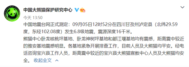 熊猫中心卧龙核桃坪基地、卧龙神树坪基地和都江堰基地均有震感,距离震中较近的雅安基地震感明显。各基地紧急开展排查工作,目前人员及大熊猫均平安。经电话咨询宝兴县工作人员,距离震中较近的宝兴县大熊猫宣教中心人员及大熊猫均安全。