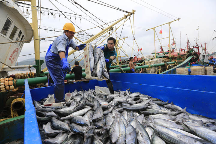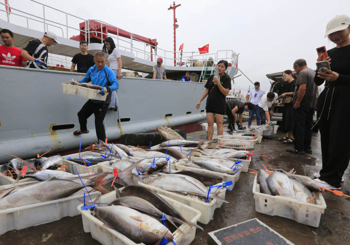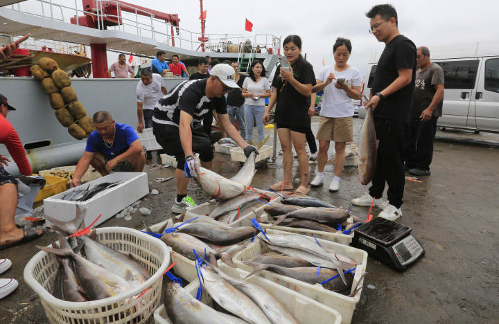 跟吴老大一样回到石浦港的渔船当中,很多都带回了新鲜的渔获。在石浦鱼丰码头,一艘海钓船卸下满仓的甘红鱼、石斑鱼、金枪鱼,渔嫂们当场直播卖货。