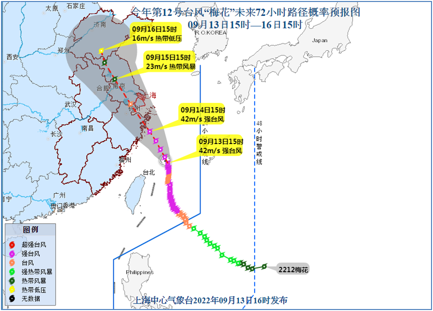 “梅花”今天(13日)17时位于距离上海浦东南汇嘴东南约545公里的海面上(北纬26.3度、东经124.0度),中心附近最大风力有14级(42米/秒),中心最低气压为955百帕,强度维持强台风级。