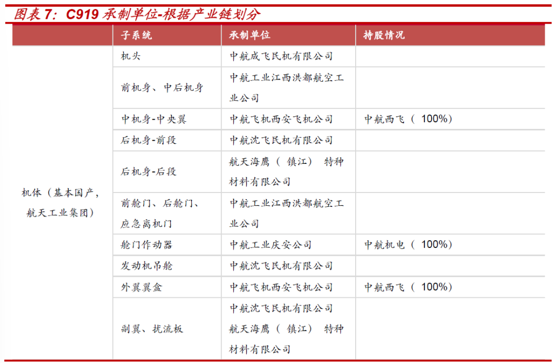 其中中航光电为C919提供产品主要包括连接器及设备架等;航发控制为国产大飞机发动机控制系统唯一的机械液压关键执行机构供应商;润贝航科为C919项目提供航空原材料及航空化学品等产品;辉煌科技参股公司飞天联合是C919航空电子产品中机载娱乐系统的供应商;通达股份子公司成都航飞的航空零部件和工装应用于C919;利君股份全资子公司德坤航空加工业务中包含C919大飞机部分零部件加工;四川九洲承担了C919客舱广播内话子系统及飞行指挥车的研制任务。