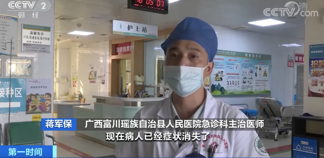 广西富川瑶族自治县人民医院急诊科主治医师蒋军保:她过来以后,我们马上及时给她用了抗过敏治疗,现在病人症状消失了。