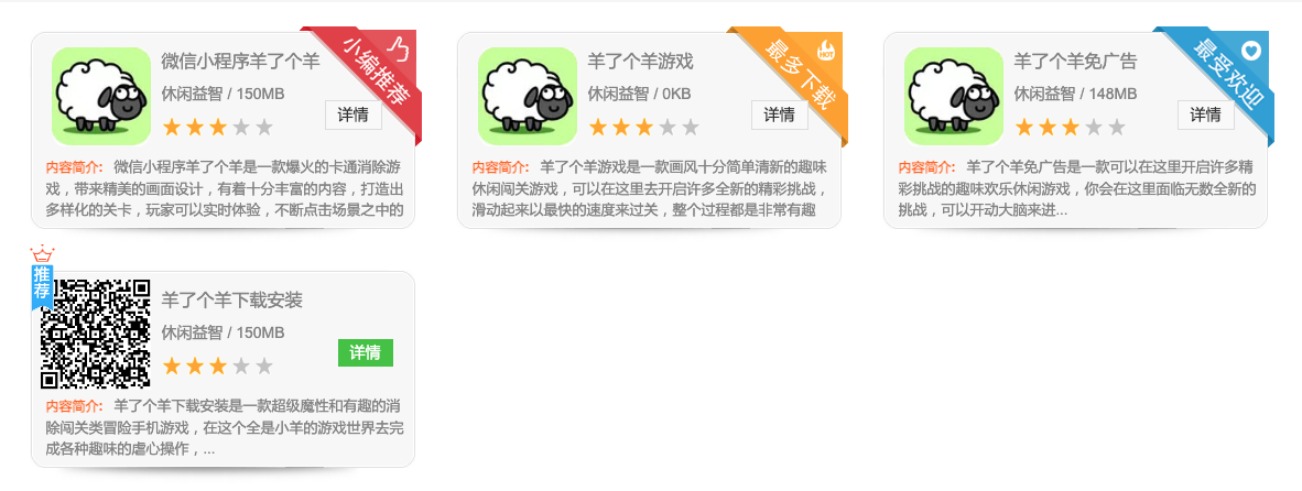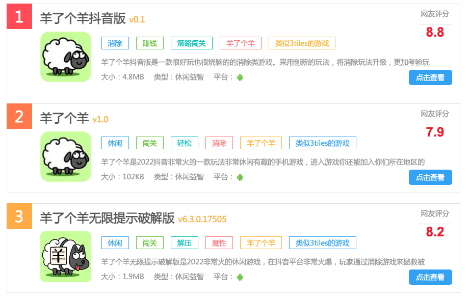 上游新闻记者发现,在网络搜索平台上输入“羊了个羊下载”,出现几十个游戏下载页面链接。记者随机进入一个下载页面发现,其中有“羊了个羊抖音版”“羊了个羊无限提示破解版”“羊了个羊去广告无限道具破解版”等十几个不同版本的分类。