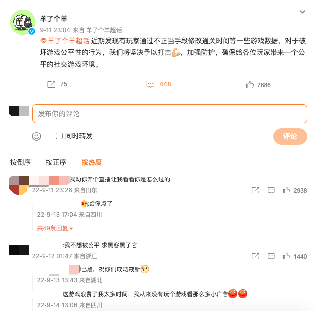 对此,《羊了个羊》官方微博近日发文表示,近期发现有玩家通过不正当手段修改通关时间等一些游戏数据,对于破坏游戏公平性的行为,将坚决予以打击,加强防护,确保给各位玩家带来一个公平的社交游戏环境。