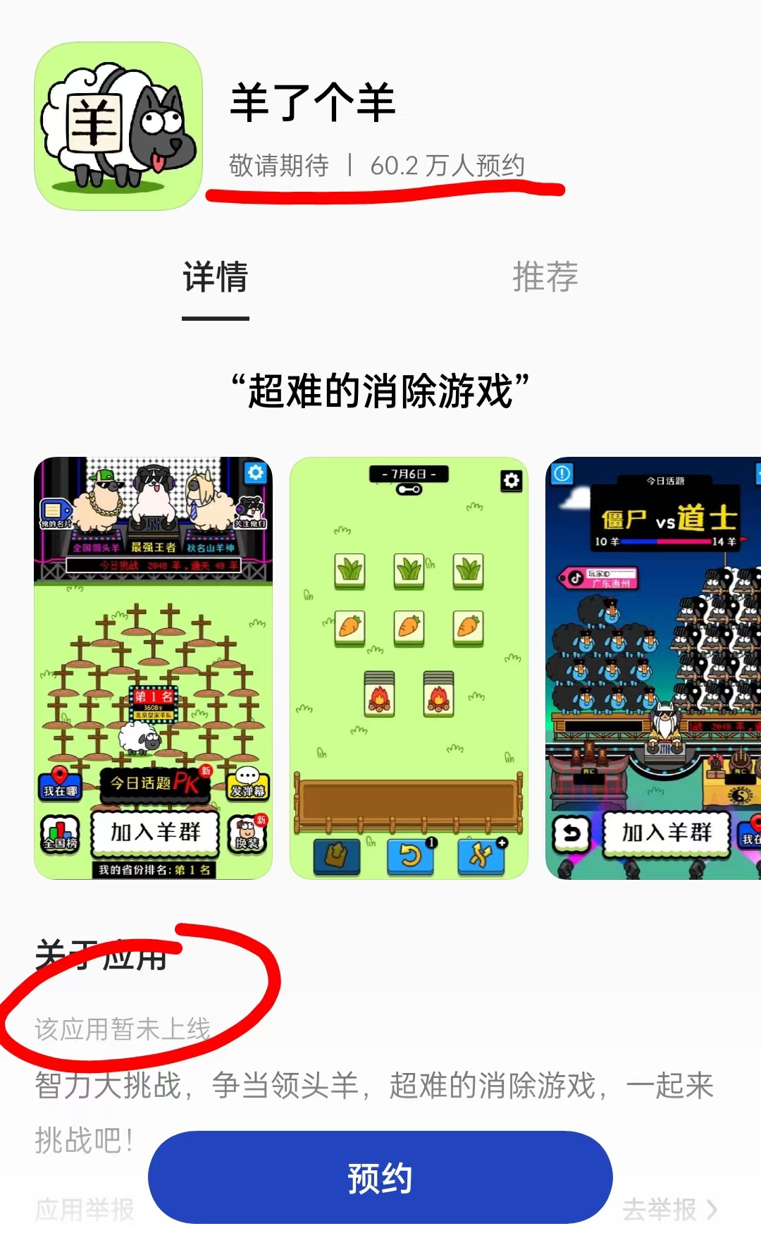 记者在手机OPPO应用商城搜索发现,《羊了个羊》游戏APP目前处于暂未上线状态,预约信息显示,有60.2万人预约了该游戏的上线通知。