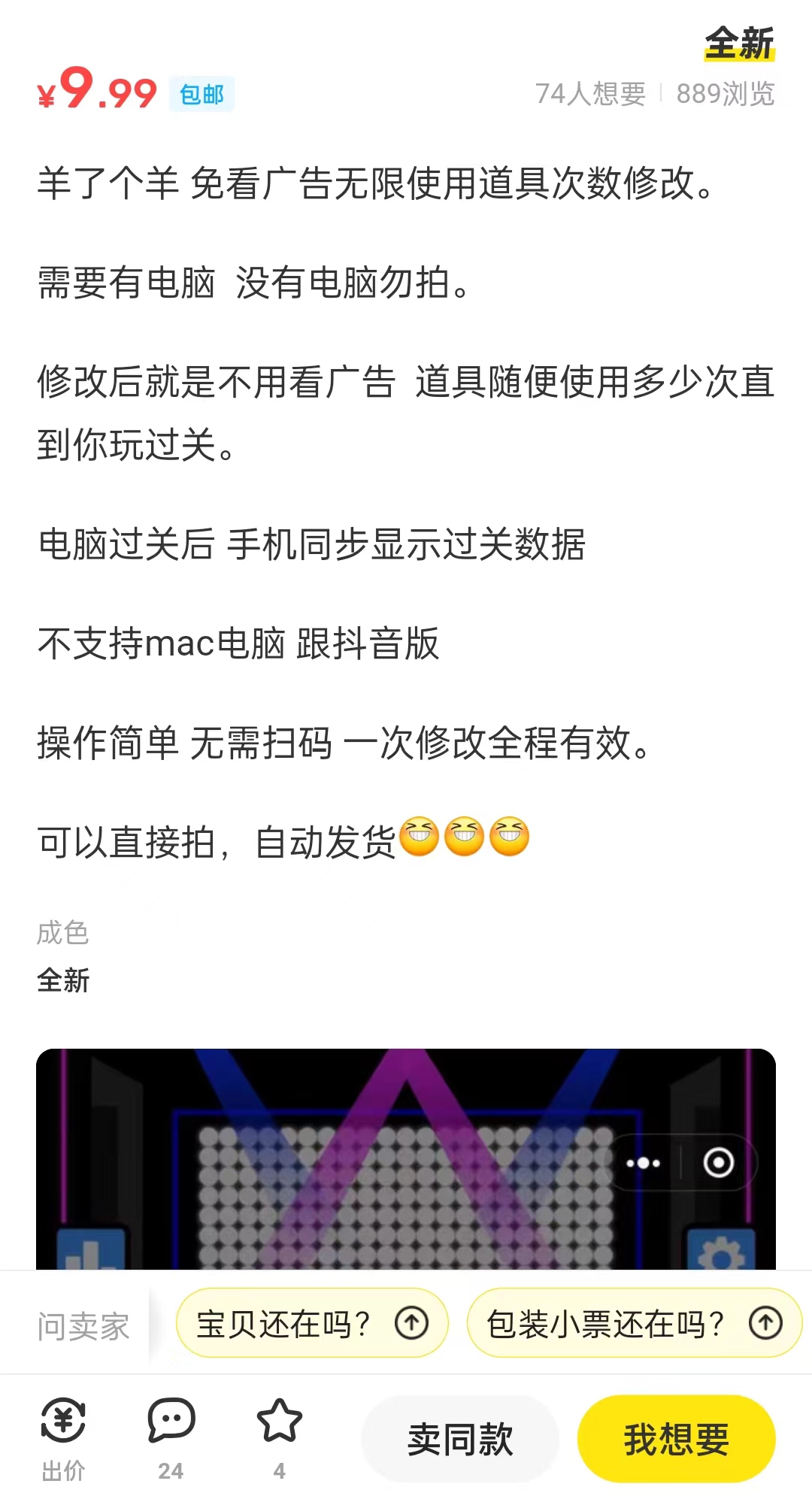 记者看到,一个“羊了个羊免广告无限使用道具”销售链接,标价9.99元,有889次浏览,其中74人成交。商品详情一栏介绍,该服务需要买家使用电脑登录微信并修改游戏,电脑上过关后,手机同步显示过关数据。卖家提示“直接拍,自动发货”。