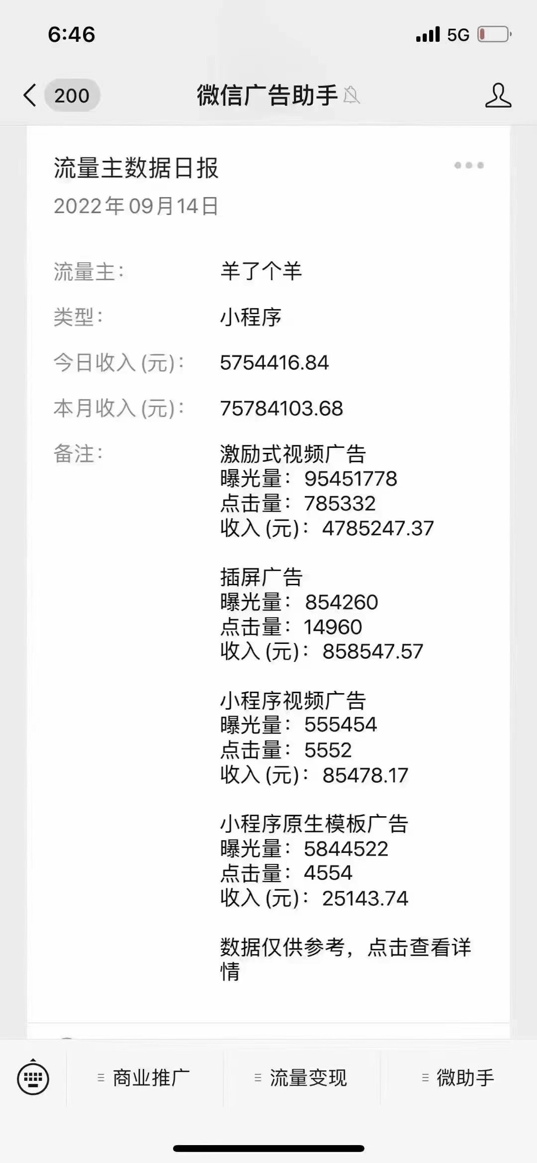 15日,网上流传一张截图显示,《羊了个羊》小程序9月14日广告收入达到468万余元,而本月收入2565余万元。当日稍晚时候,又传出另一张图显示,《羊了个羊》小程序9月14日广告收入超过575万元,而本月收入更是高达7578万余元。