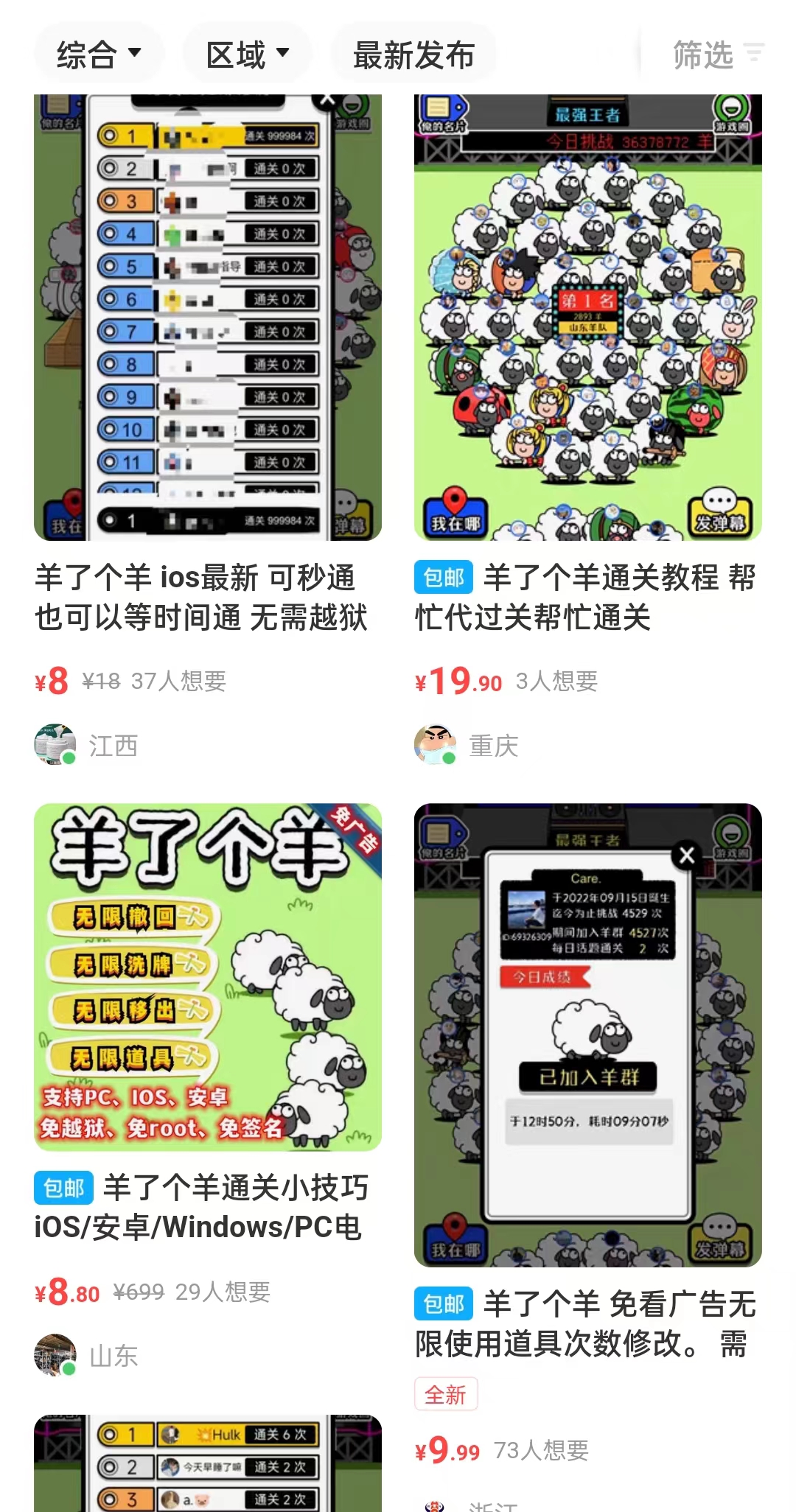 由于《羊了个羊》的通关难度太高,也有玩家另辟蹊径。上游新闻记者发现,在某二手网购平台上,有卖家销售《羊了个羊》的通关教程、免广告或无限使用道具外挂文件,甚至还有卖家以登录买家微信账号代玩方式提供通关服务。