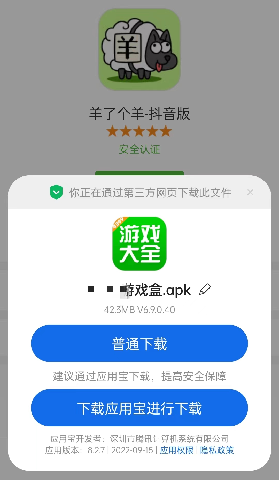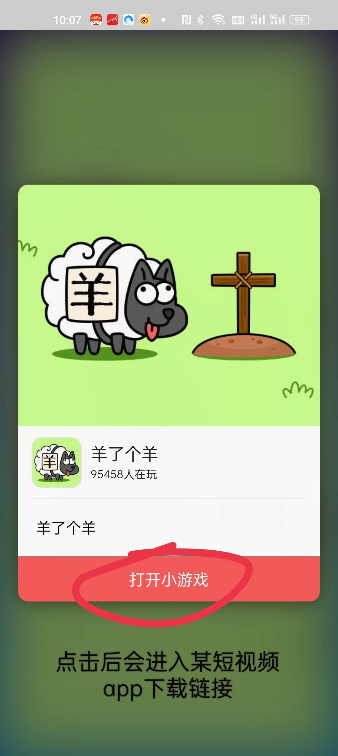 记者点击“羊了个羊去广告无限道具破解版”将程序下载到手机安装后,却发现打开后根本不是游戏,而是某短视频平台的下载链接。而另一个“羊了个羊抖音版”的下载程序,则最终指向了某游戏盒APP的下载。
