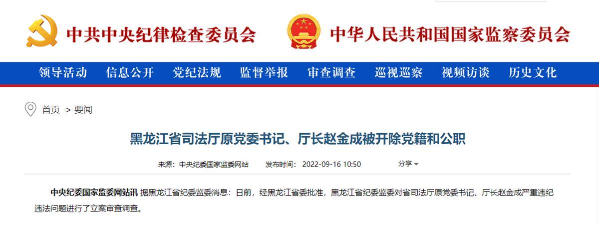 中央纪委国家监委9月16日消息,黑龙江省司法厅原党委书记、厅长赵金成被开除党籍和公职。