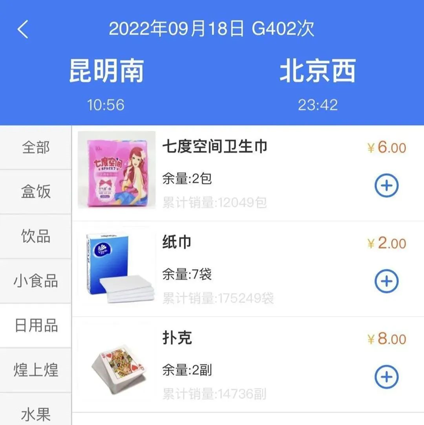 一些城市的地铁站推出了“爱心便民箱”服务,有常用药品,也有卫生巾等物品,这些物品平日里可能并不显眼,却可能给处于紧急情况的人“雪中送炭”。有高校推出“卫生巾互助盒”,也是为了让有急用的学生不至于太忙乱。回到高铁该不该售卖卫生巾这个话题上,有网友发现,并非所有高铁都不售卖卫生巾。在昆明铁路局APP“昆铁+”上,可购买的日用品中就有卫生巾,截至红星新闻记者发稿时,累计销量为12049包。
