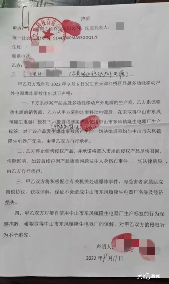 董保生告诉大皖新闻记者,他很同情受害者的遭遇,在淘宝上,“品晟旗舰店”挂的链接显示是隆生电器厂的产品,“展示出来的图片是我们的图片不假,顾客需要一款1500瓦的移动电源,但‘品晟旗舰店’给他推荐的另外一款鹏之欣公司生产的1500瓦的移动电源(白色),私自违规帖成了我们(中山市东凤镇隆生电器厂)的标。”董保生表示,目前中山市鹏之欣科技有限公司和发生爆炸的移动电源“品晟”销售商,都已经写了声明书,“让我们谅解,已经在我们当地工商局备案了,鹏之欣剩下的货已经被工商部门查封拿去质检了。”