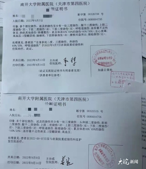 大皖新闻记者了解到,目前时老夫妻仍然在南开大学附属医院重症烧伤科监护室住院治疗,全身多处二度、三度烧伤,仅仅几日治疗费用已花去近一百万元,而后续的治疗费用更是高达二三百万元。
