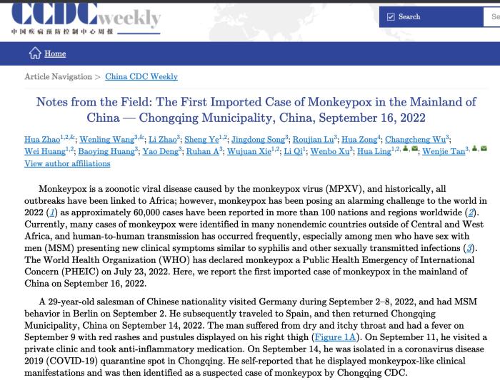 根据中疾控发布的《现场纪要》,该病例为一名29岁的中国籍男子,9月2日至8日在德国,随后前往西班牙,于14日返回重庆,并被隔离在当地新冠肺炎隔离点。他自述出现类似猴痘的临床表现,随后被重庆市疾控中心确定为猴痘疑似病例。