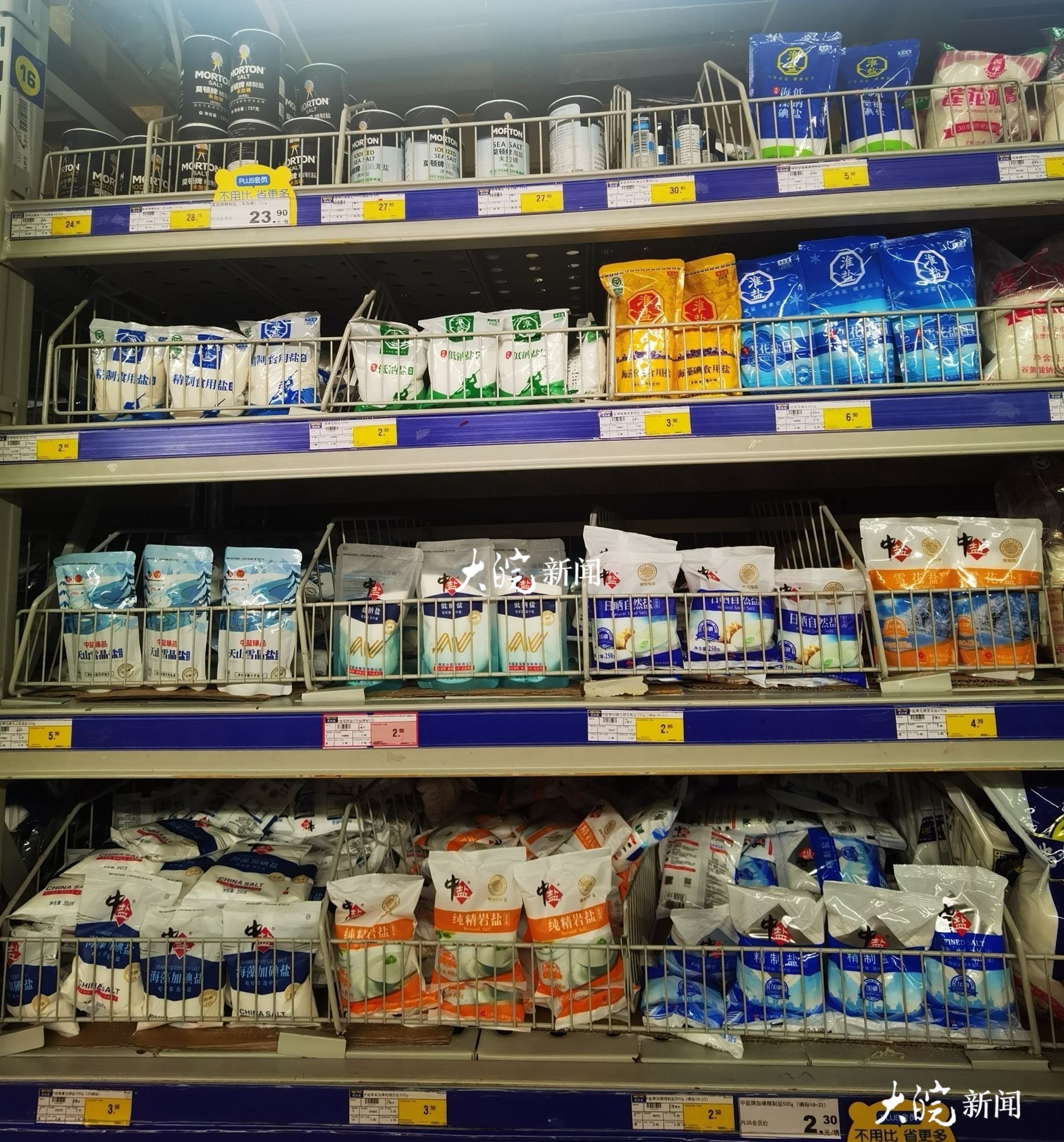 9月20日下午,在南二环路一家大型超市,食盐的货架放得满满当当。记者注意到,袋装盐售价从2.3元到6.9元不等。其中,2.3元的显示为“精制盐加碘”,规格为500克。最贵的为一款“雪花盐”,规格200克6.9元,显示“精制海盐加碘”。此外,还有纯精岩盐、海藻加碘盐、日晒自然盐、低钠盐等品种,售价多在3元左右。
