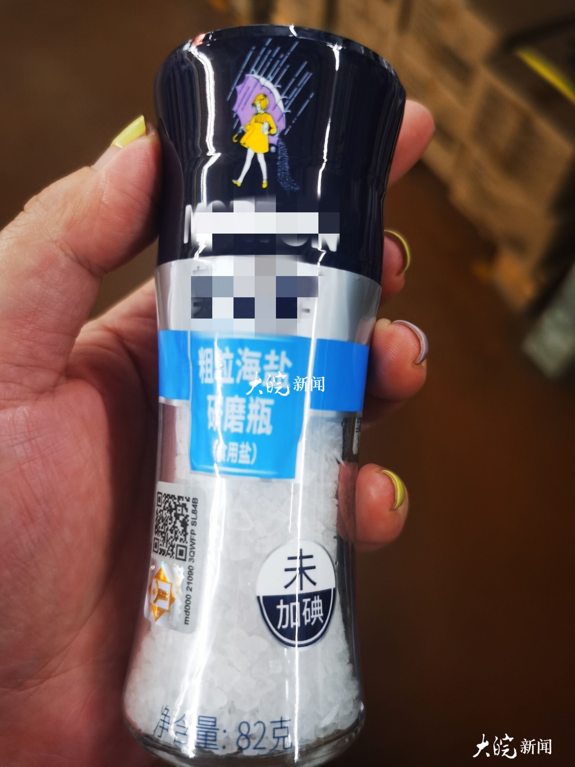 在货架顶层,记者看到了多款罐装盐。其中737克的无碘盐、加碘海盐分别为28.7元、24.9元,瓶身显示“源自于美国的百年品牌。”同品牌的另一款瓶装盐仅82克,瓶身显示“粗粒海盐研磨瓶(食用盐)”,售价30.8元。将该规格折算,比两三元钱500克的袋装普通盐贵了有几十倍.