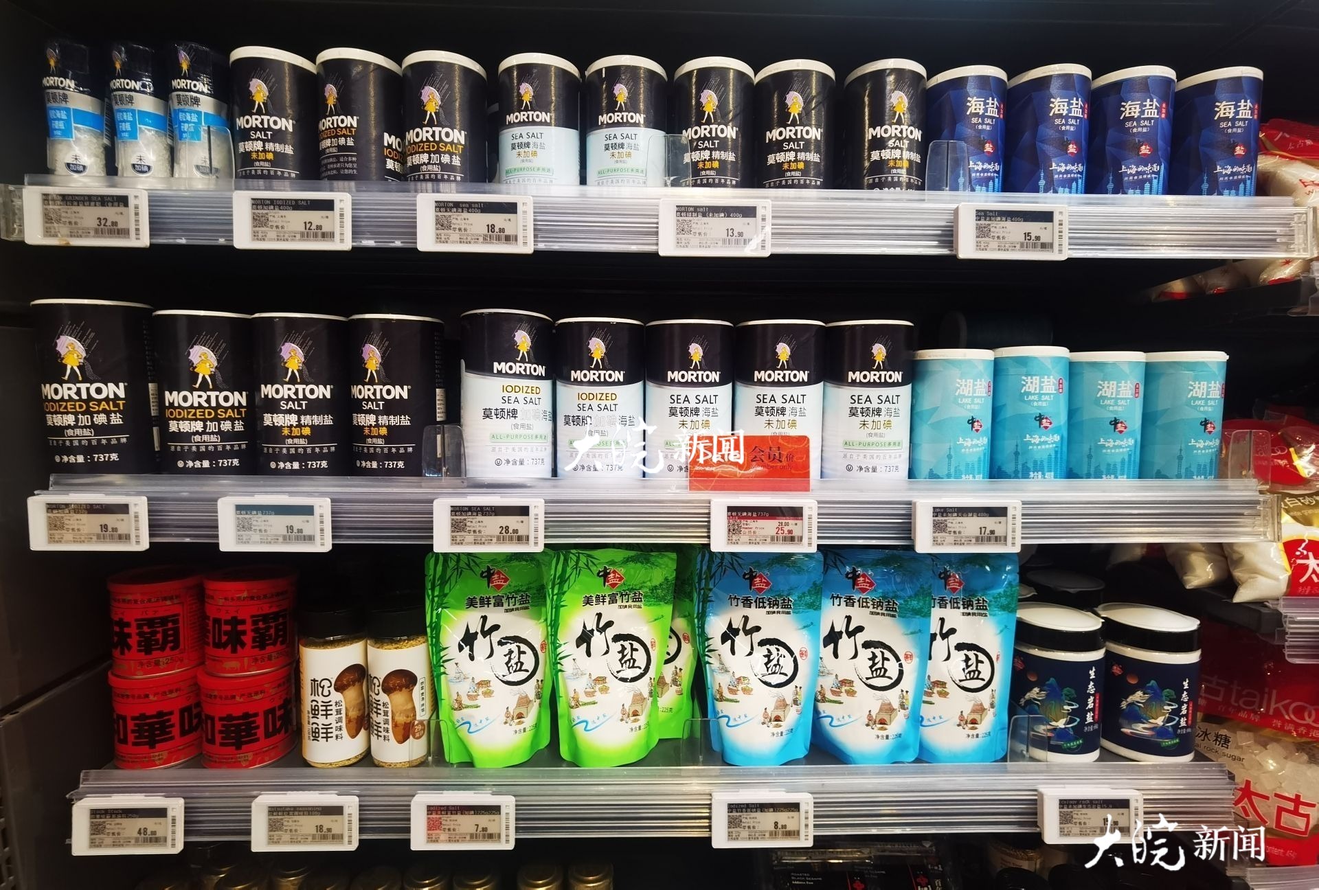 9月21日,在绿洲东路的一家超市内,记者看到食盐选择很多,从7.8元225克的袋装竹盐,到32.8元82克的进口瓶装盐可选。