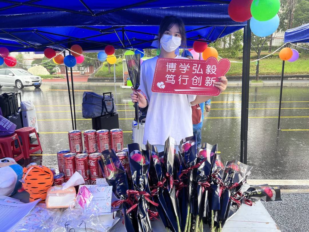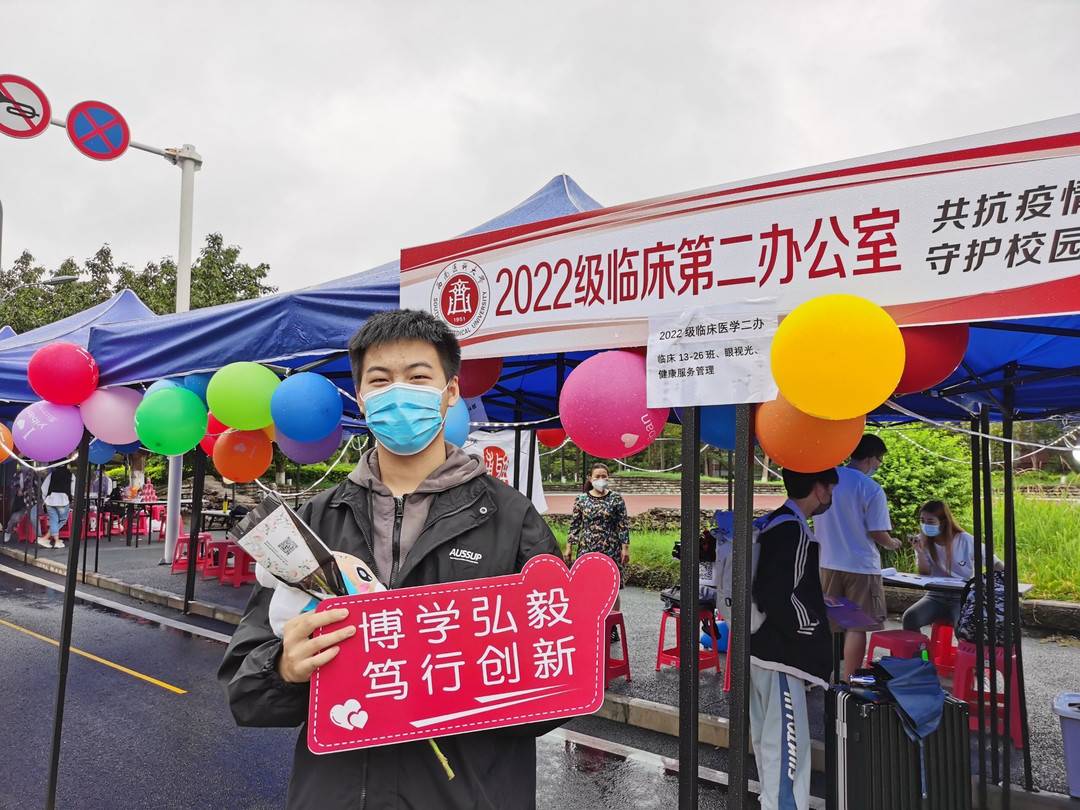基础医学院报到点布置着各色的气球,桌上摆放着一束束玫瑰花和一排排可乐,以及西南医科大学校园文创品。该院党委副书记黄钰介绍,这是为了给学生们制造一点“小惊喜”,全院55名老师一起参与场地布置和迎新工作。“可乐被大家称为‘快乐水’,希望同学们都能快快乐乐享受大学生活。”黄钰说。