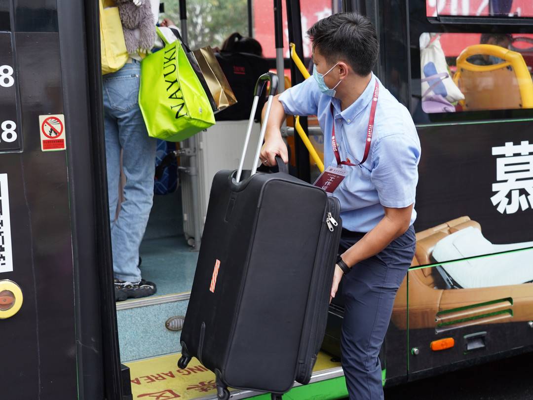 上午九点,西南医科大学南大门外,新生们早早到达,有序排队准备进校。他们拉着行李,经过体温监测门,出示健康码、行程卡和48小时核酸检测报告,在完成疫情防控检查后,有序进入校园。刚进校门,教职工迎新志愿者接过了同学们手中的行李,询问宿舍位置后,拉着行李箱、提着大包小包,带着同学们到相应线路的摆渡车旁等待上车。