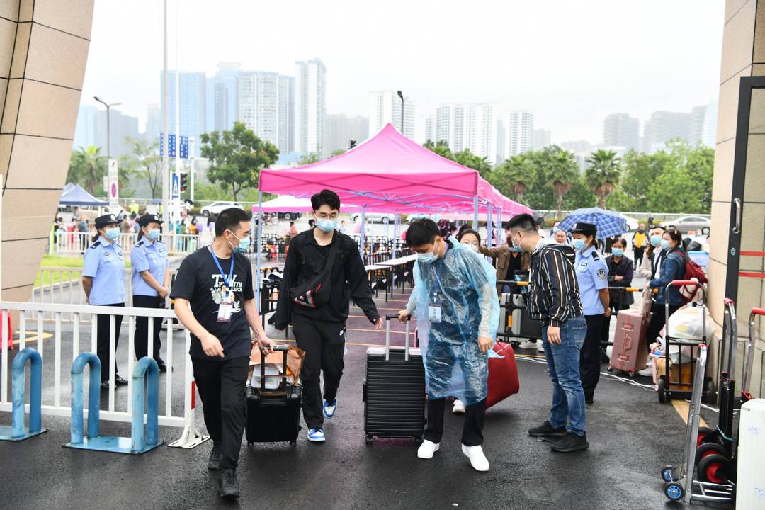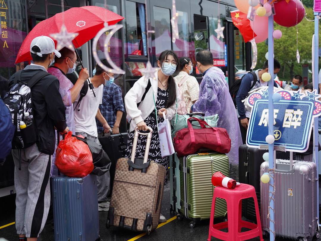 “1舍—17舍的同学坐这趟车,往青年广场方向。”“来,同学,行李给我,你先上车。”9月22日,经历高温、疫情后,西南医科大学迎来今年秋期新学期开学,首批3000余名大一本科新生和研一新生陆续到校报到。淅淅沥沥的雨中,该校近500余名教职工“变身”为志愿者,在机场、高铁站、客运站、校门口等点位迎接新生。