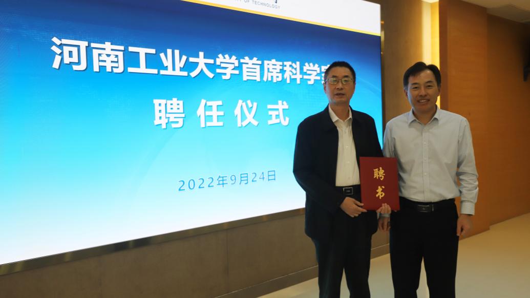 李成伟代表学校与谢明勇院士签署协议,并向谢院士颁发河南工业大学“首席科学家”聘书。河南工业大学官网图
