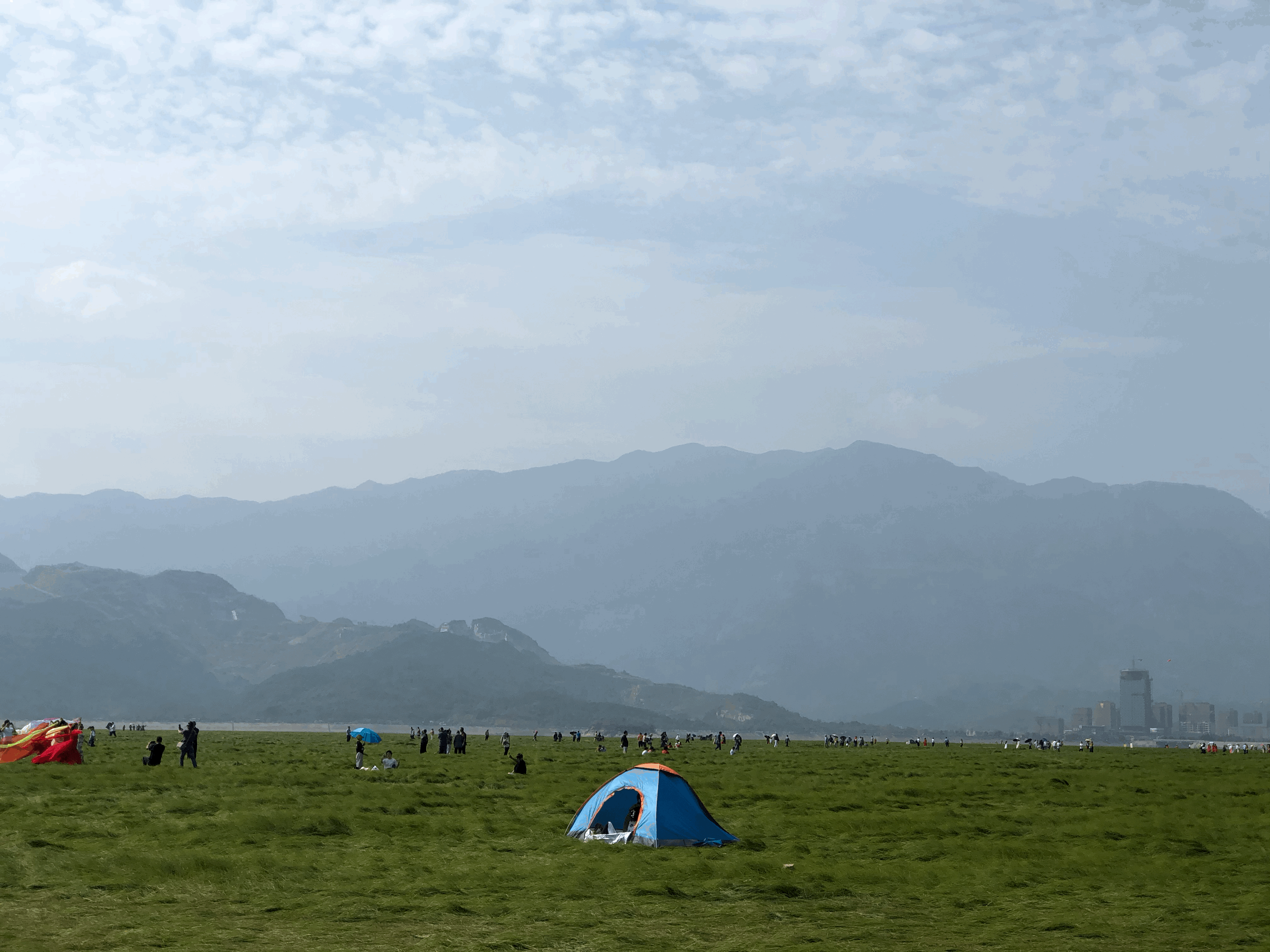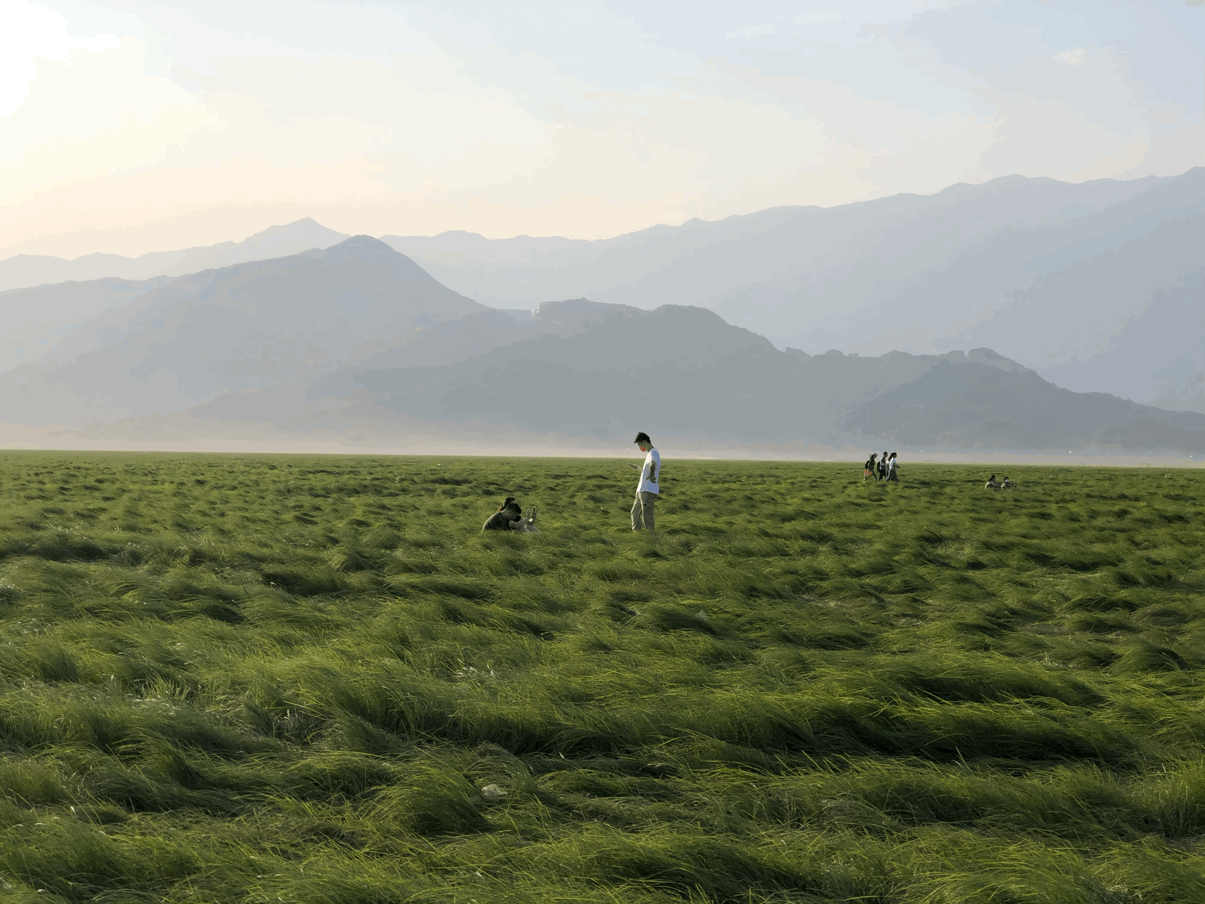 中午过后,游客变得更多,偌大一片草海里点缀着数不清的人,孩子们举着风筝在草里奔跑,大妈们的丝巾肆意飞扬。更多的小摊贩也聚集在这里,卖饮料、柠檬茶、绿豆汤和帽子等,数不胜数。这里的热闹程度不输一个景区。有不少志愿者前来捡垃圾,草海里竖了不少提示爱护环境的标语,甚至还添置了四间移动厕所。