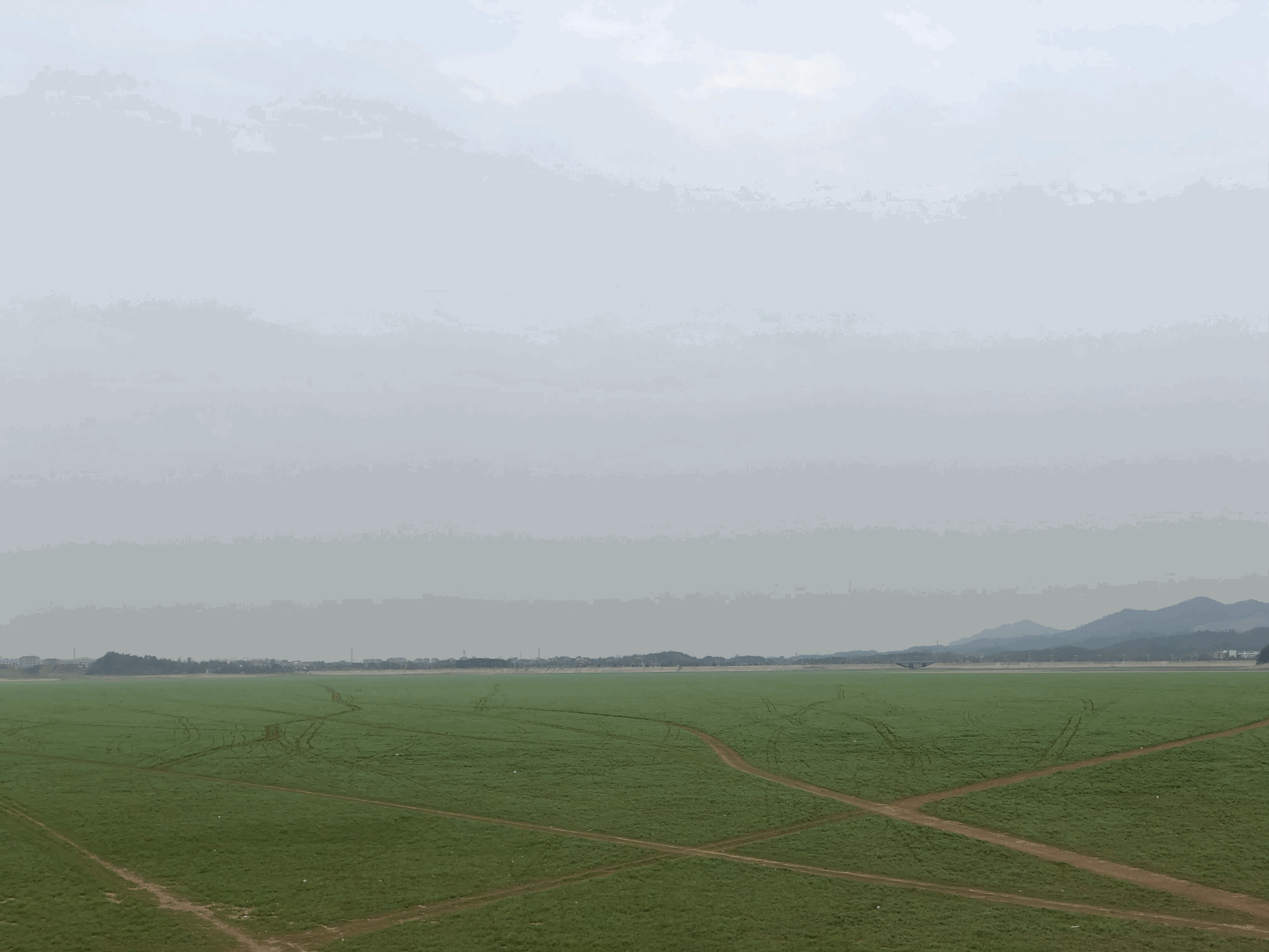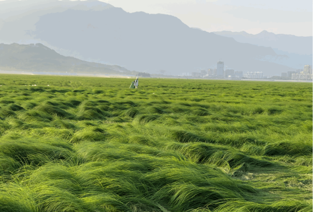 再远些,湖床上开始长草,绿色的草一片接着一片,俨如一片绿油油的“草海”。