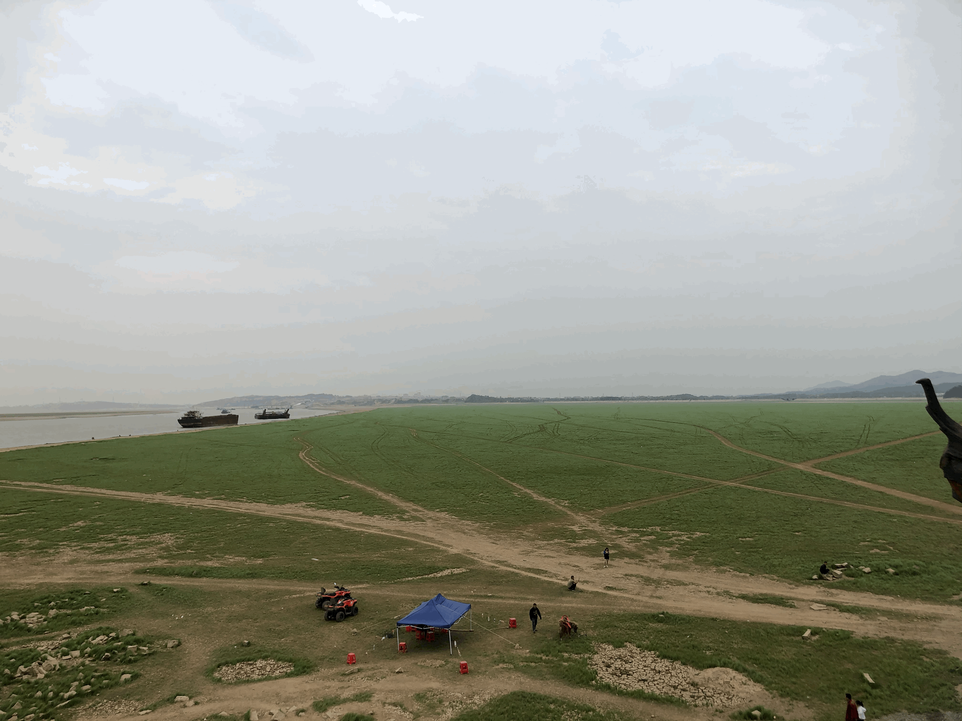 而在9月下旬,从堤坝往湖中看去,目光所及,只能看到一条小小的河流,其余空旷的地方长满了野草,近岸边的草甚至已经枯黄发脆。