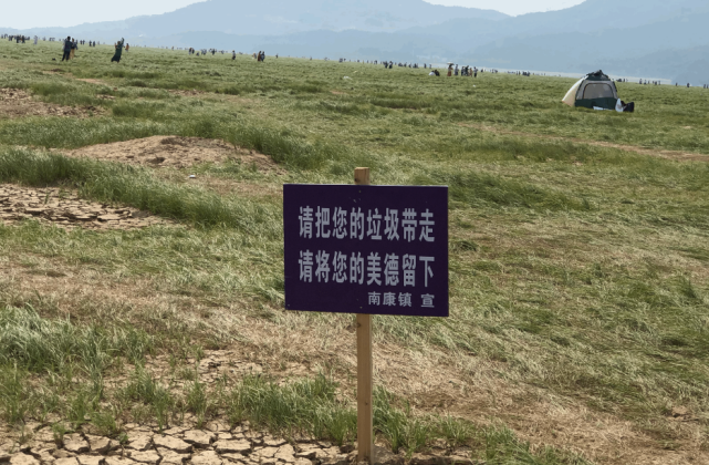 沿着庐山市湖滨路边的栅栏往前走,能看到不少和鄱阳湖有关的安全提示,比如不要随意乘坐没有安全保障的“三无”船只出湖游玩,又比如堤坝上写着显眼的标语,提示船只请勿在离岸500米内停靠。